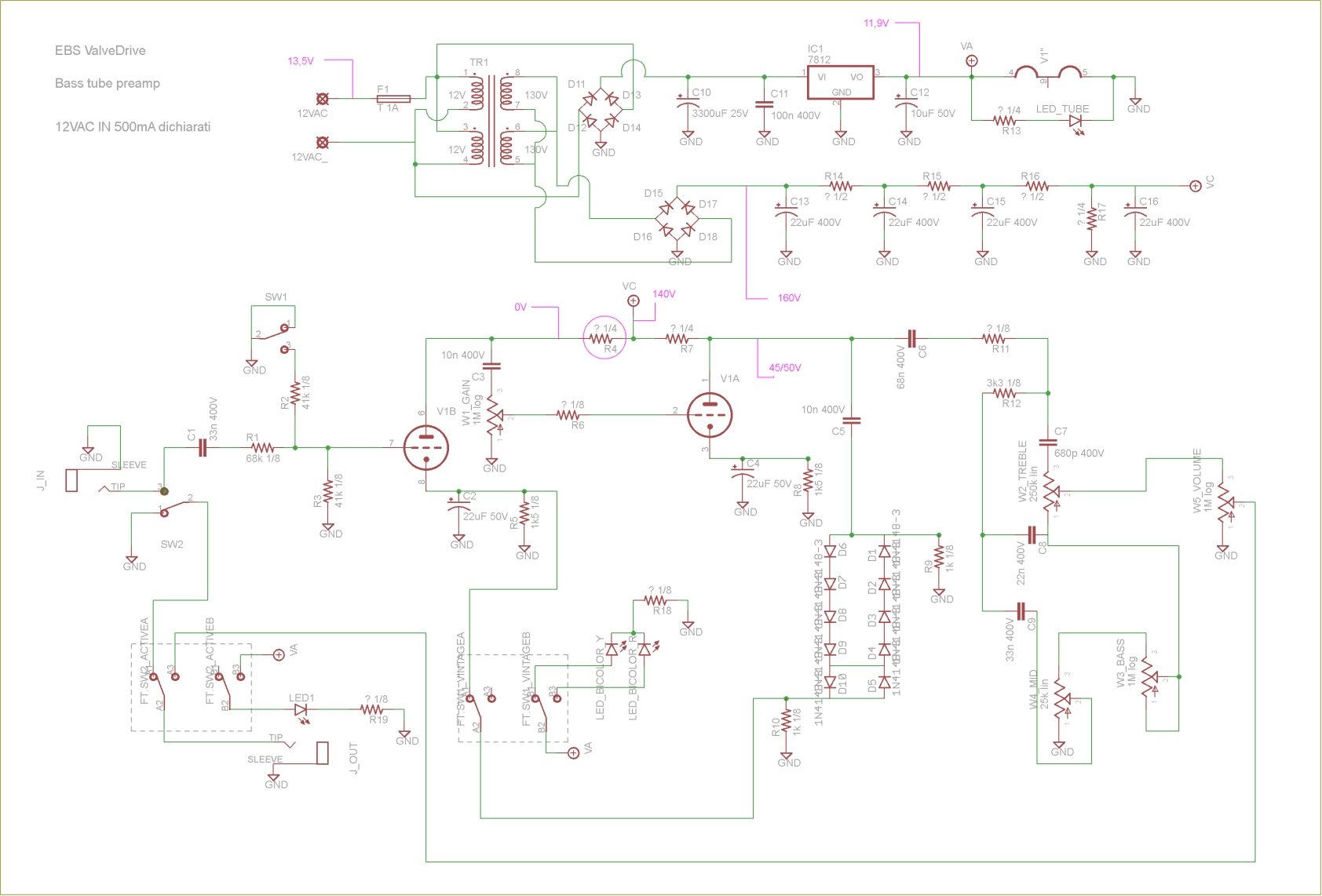 Bonsoir a tutti! come sempre, posto per chiedere aiuto MA stavolta metto anche lo schema del pedale in questione, l'EBS ValveDrive :numb1: Per chi non lo sapesse, è un preamp a valvola specifico per basso. Me lo hanno portato da riparare (muto) dicendomi che altri avevano già provato a metterci le m...
