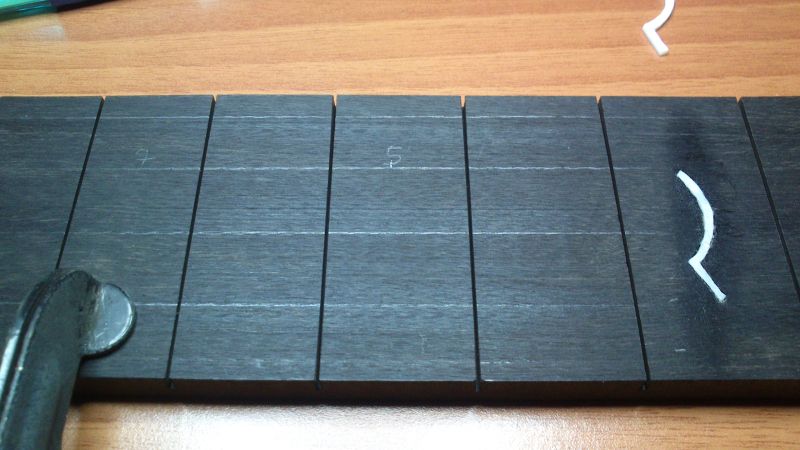 Per fare i tagli consiglio l'utilizzo di un seghetto da ferro piccolo con lama liscia (ce n'è anche di ondulate ma occhio che fanno i solchi troppo larghi!), ha la larghezza giusta per alloggiare i nostri frets.