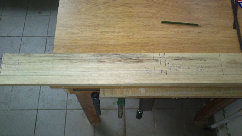 Per prima cosa segno a matita le zone di cambio piano sulla paletta e sul tacco del manico, poi fisso con un paio di morsetti il legno ad un piano di riferimento, sotto al manico è posizionato uno spessore di qualche cm livellato con la pialla per facilitare la lavorazione. Si può anche semplicemente girare il manico da un lato all'altro, cosa che comunque è da fare.