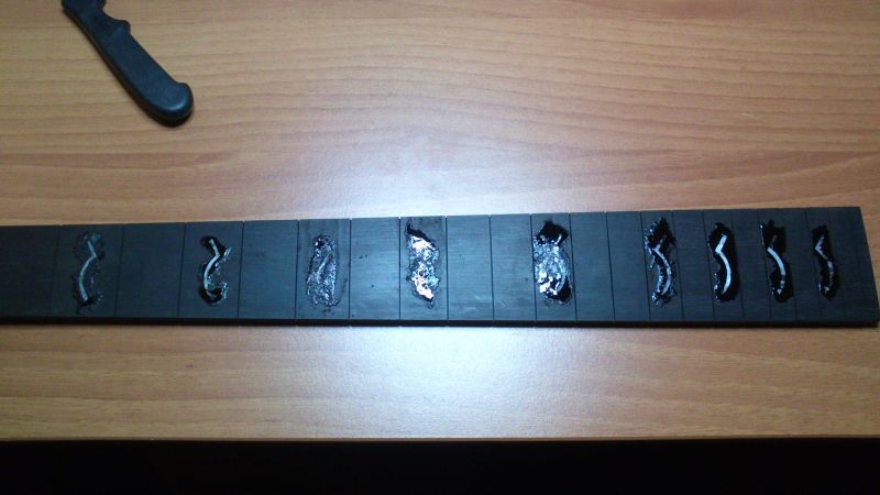 Dopodichè una bella passata di cianoacrilico (alias super attack, ma va bene qualsiasi clone...) e poi si inserisce l'intarsio avendo cura di farlo arrivare fino in fondo. Naturalmente la profondità dello scasso dovrebbe essere pari allo spessore dell'intarsio, o almeno sufficiente a garantire materiale sufficiente per quando si farà la raggiatura della tastiera