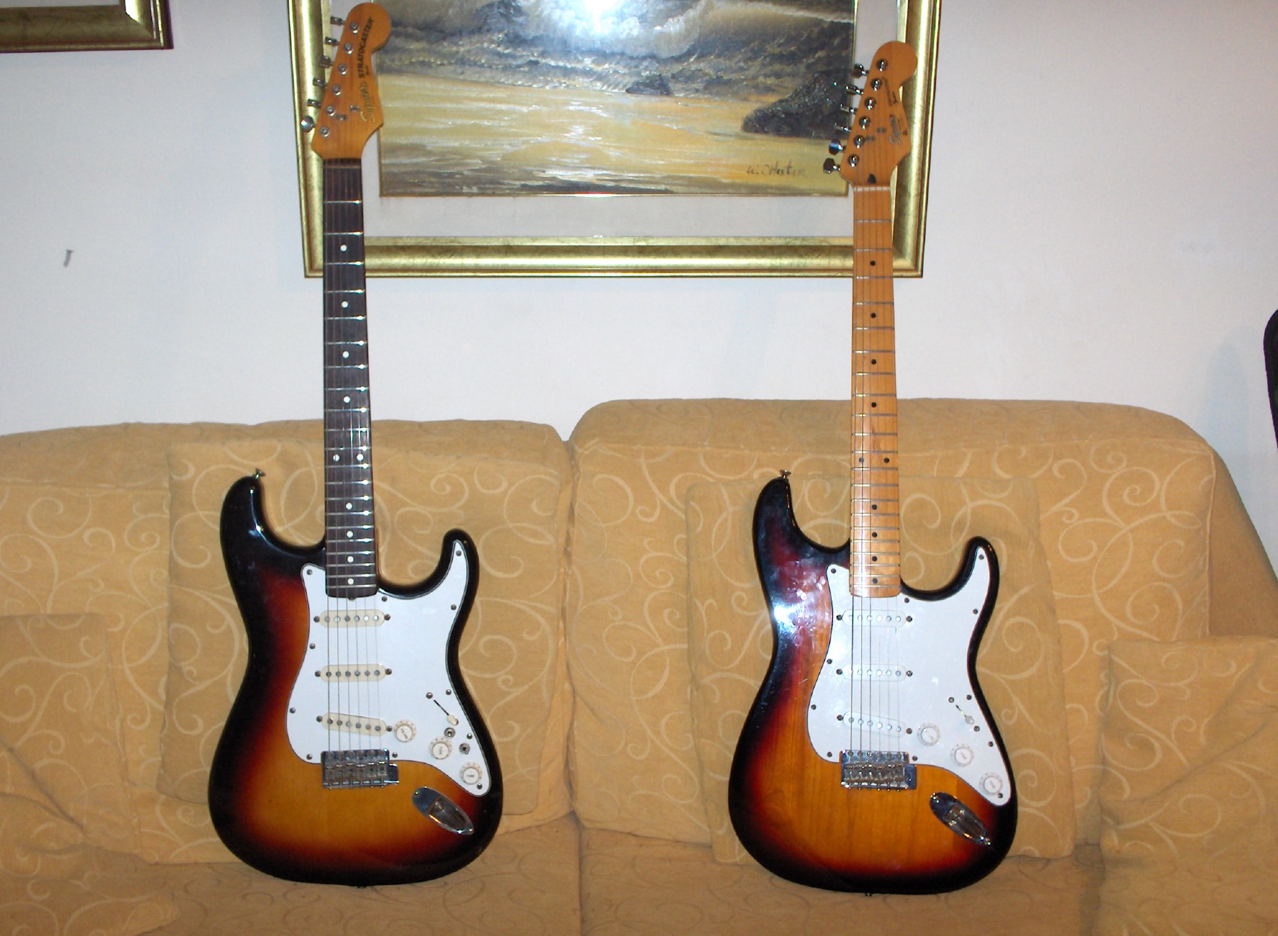 No no.. la mia (quella a destra) non è una squier, ha solo il manico squier che ho appurato essere stato fatto dalla samick nell'89, l'altra è una squier serie JV dell'82, purtroppo fatta modificare anni fa dal proprietario con tasti jumbo e switch per l'inversione di fase sui pickup. Non ho ancora potuto fare una foto ravvicinata delle venature del body sulla mia chitarra ma credo di poter escludere che sia agathis.