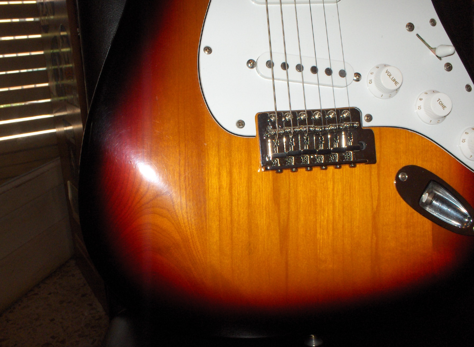 Salve ragazzi, mi serve il parere di qualcuno per identificare il legno del body della mia strato, ho sempre creduto che fosse tiglio perchè chi me lo ha venduto mi ha detto così, ma l'altro giorno un amico mi ha messo una pulce nell'orecchio dicendomi che potrebbe trattarsi di frassino, il peso è quello di una normale stratocaster. Posto una foto dove si vedono alcune venature,i ce n'è una molto larga proprio sulla smussatura, la chitarra è quella con il maple neck sulla destra, accanto c'è la squier JV di un mio amico così approfitto per mostrarvi anche questo gioiellino  :face_green: