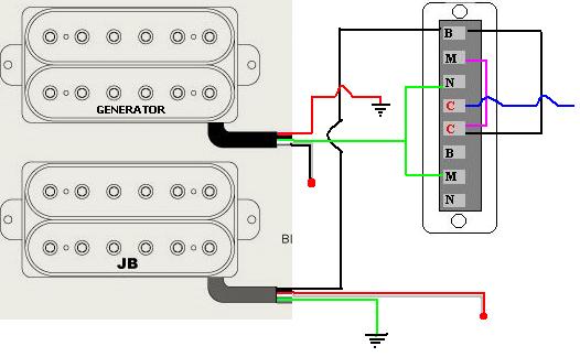 la mia Ibanez monta 2 humb (Tonerider Generator al manico e JB al ponte), lo switch è quello classico ibanez a 5 posizioni. Ora vorrei poter cablare il tutto in modo da avere: