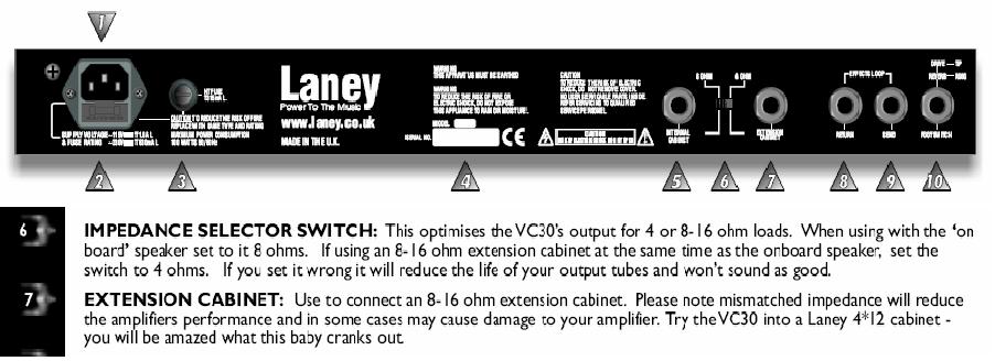- Laney Vc 30 212: bellissimo ampli interamente valvolare con possibilità di scegliere tra due impedenze ( 4 - 8 ohm) con presa jack per cabinet addizionali esterni. Quando si utilizzano i coni dell'ampli l'impedenza selezionata è 8 ohm.