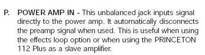 - Fender princeton 112 plus: piccolo (ma terribile all'occorrenza) transistor da 65w RMS con un bel cono Celestion da 12'' ed impedenza da 8 ohm. Dotato di power amp in (return) e preamp out (send).