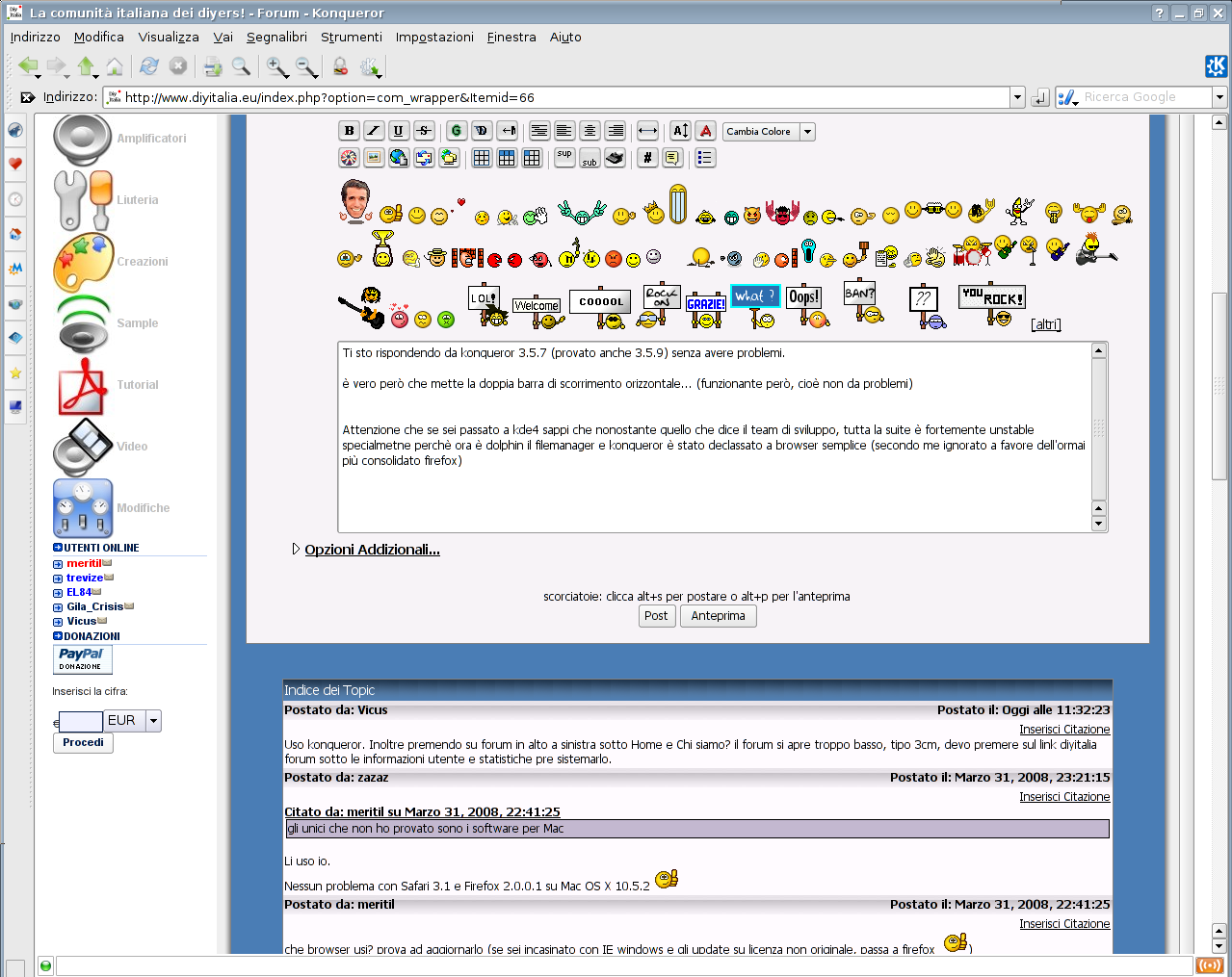 Uso konqueror. Inoltre premendo su forum in alto a sinistra sotto Home e Chi siamo? il forum si apre troppo basso, tipo 3cm, devo premere sul link diyitalia forum sotto le informazioni utente e statistiche pre sistemarlo.