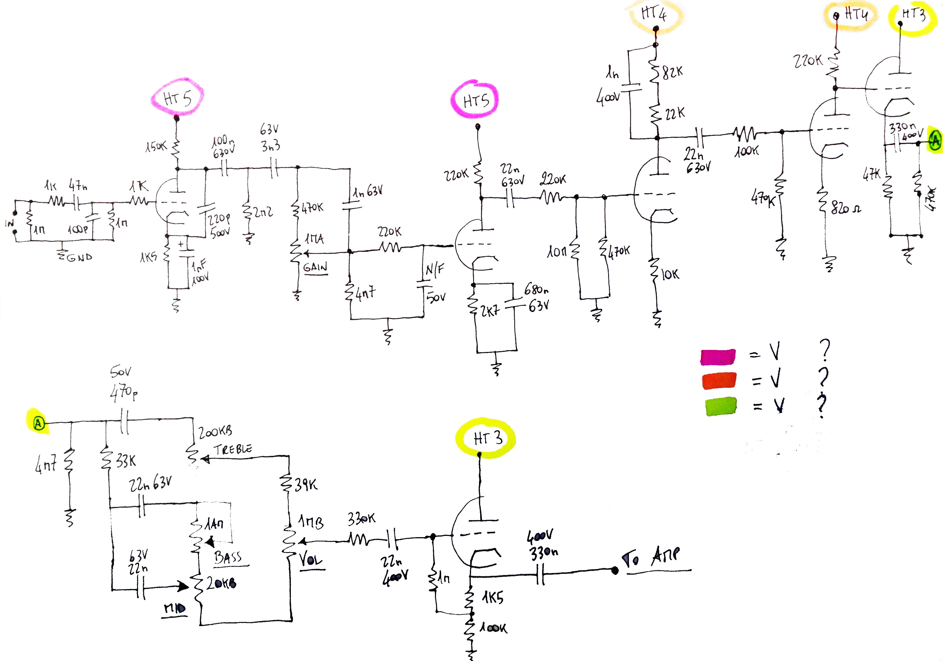 yes.. oggi ho stabilizzato la tensione dell'anodica HT3 a 268V ,ho fatto delle prove con il valore del condensatore che si trova tra la griglia e la massa secondo stadio, ho provato vari cap a partire da 680p - 2.2n - 4.7n più si va verso i microfarad come valore più il suono si pulisce diventa meno incazzato, la testa originale non lo monta proprio ma se lo tolgo ho un camion rimorchio di gain :surpr: :surpr: :surpr: