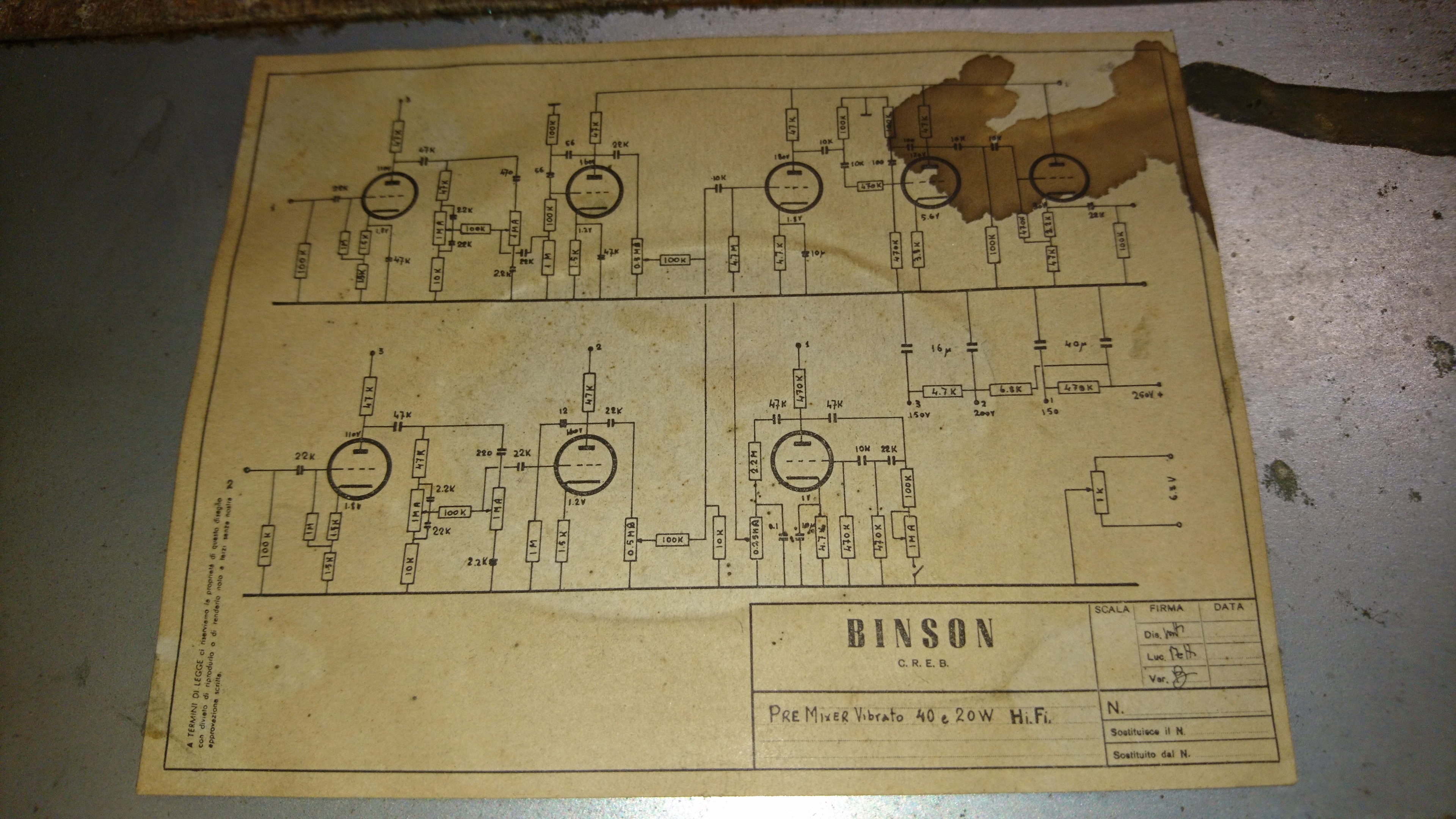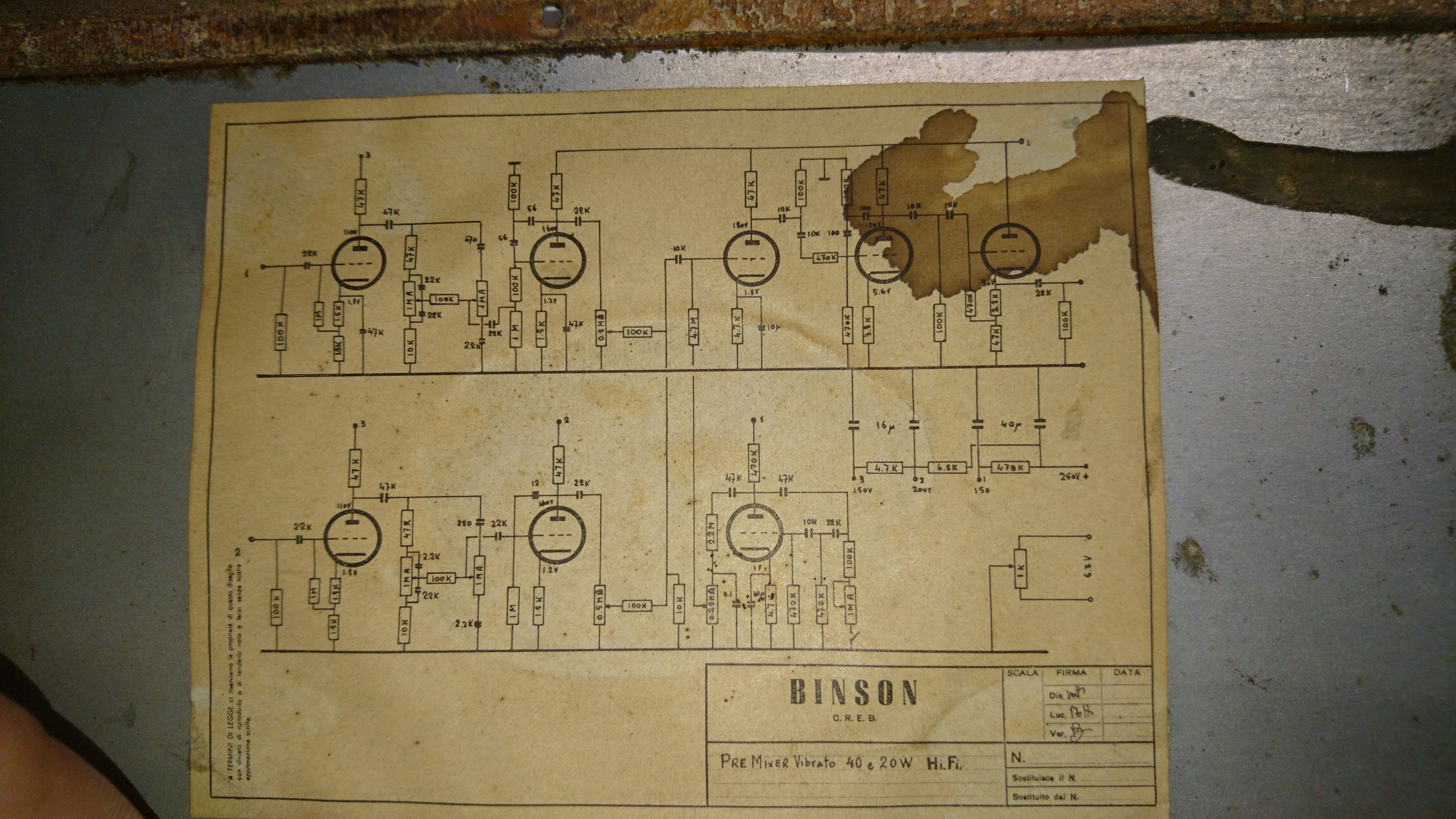Mi hanno portato un vecchio Binson 20w da "restaurare" e devo dire che è messo meglio dentro che fuori. A prima vista sembrava un cadavere e invece non è poi messo così male.