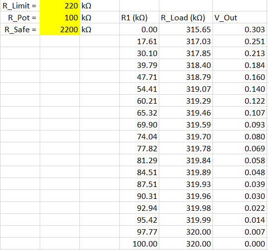 Per cui, scegliendo R_Limit = 220k, R_Pot = 100k ed R_Safe = 2.2M ho un carico visto dalla PI pressochè costante lungo l'escursione del pot (varia da 316k a 320k).