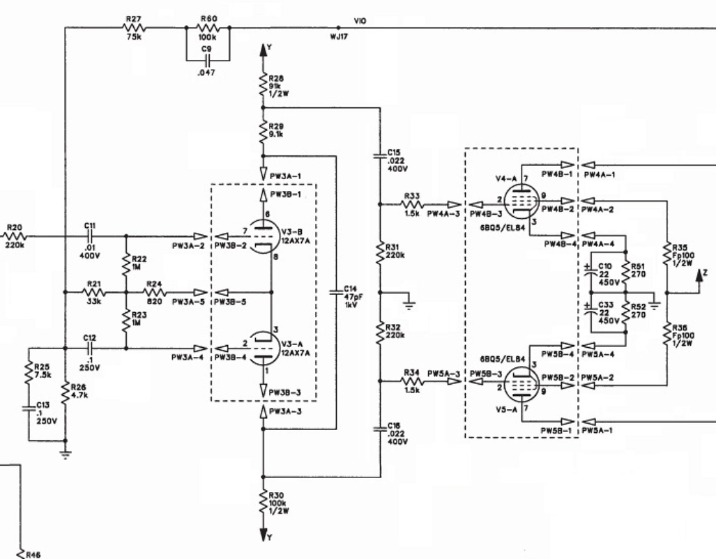Ciao, il feedback non é fra anodo ed anodo, ma fra uscita (a) e ingresso (g1) per ogni singola valvola finale.