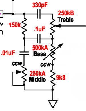 Il tonestack che ho utilizzato e' quello allegato (fra i pin 1 e 3 del pot dei bassi c'era un cap da 1n, ma l'ho eliminato perche' slabbrava troppo i bassi).