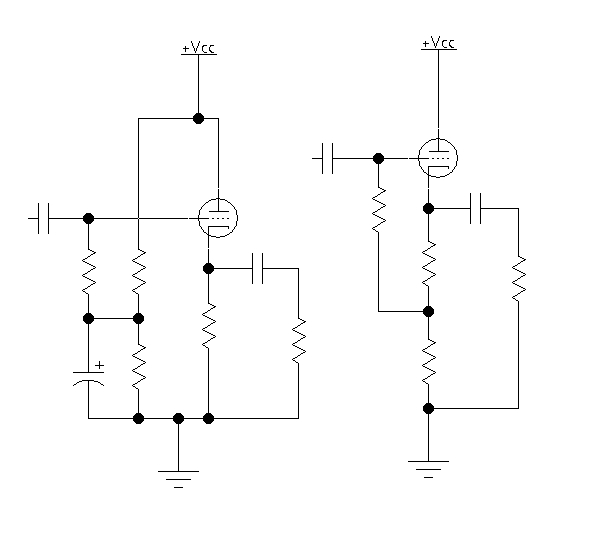 Io credo che il più trasparente sia quello di sinistra, tuttavia quello di destra è stabilizzato termicamente ed è più robusto e duraturo (facci caso, se aumenta la corrente di placca aumenta la caduta di potenziale sulla res di catodo chiudendo di conseguenza il gate alla griglia e riportando la corrente di placca sotto controllo).