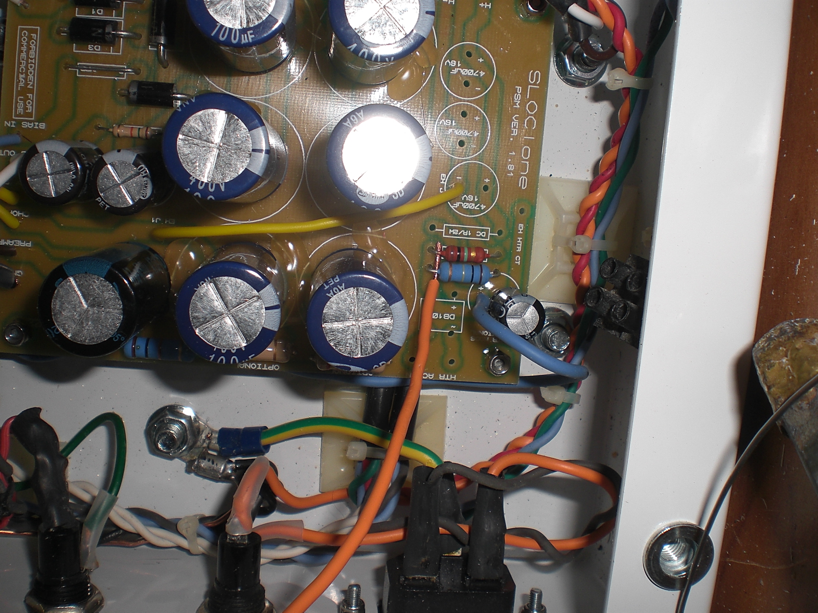 Allora ricapitoliamo , di questo errore me ne sono accorto guardando la foto allegata , il filo arancione è il comune delle due resistenze da 100 ohm ,ed il buco dove doveva essere collegato Il CT è vuoto ... quindi mi sono dimenticato di collegare il CT che è rimasto collegato allo star ground .... ed in più le due resistenze non servivano a niente per via che il trasformatore era già 3,15-0-3,15...mai il punto è nell'eliminare i ronzio della testata le due cose che ho visto avere i risultati migliori e molto evidenti sono appunto questo collegamento e poi anche se sembra incredibile perchè tutti ne sottolineano di non farlo assolutamente e collegare la massa del fs allo star gronud diciamo dando una percentuale hanno tolto il 40% del ronzio il collegamento a cavolo delle resistenze ed il 50% il foot sw allo star ground ...il 10 % è rimasto