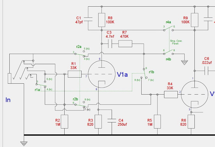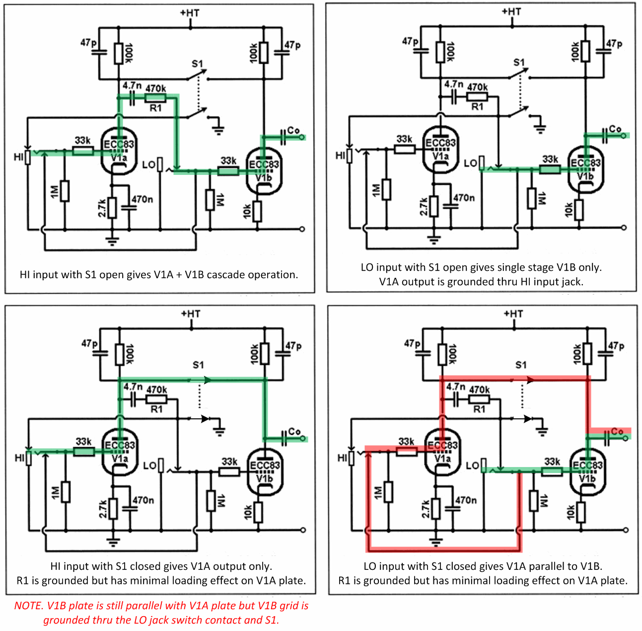 Quando viene usato l'ingresso HI R1 (R7 del tuo schema) viene disconnessa dalla massa e resta collegata allo switch dell'ingresso LO, quindi il segnale entra in V1a, ne esce e va alla griglia di V1b per essere ulteriormente amplificato, in questo modo si ha un normale circuito con due stadi in cascata