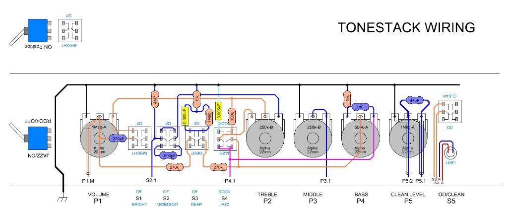 Mentre invece il "ROCK / JAZZ" , il "DEEP" e il "BRIGHT", sono solo switch fisici messi il più vicino possibile al circuito del tonestack del clean. E mi sembra un'ottima cosa.