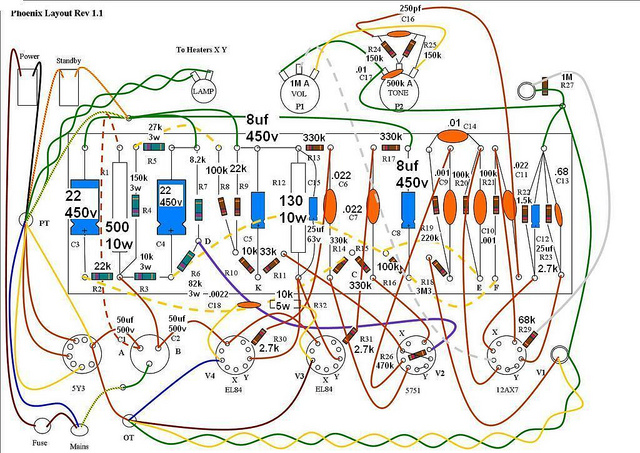 Per la divisione del circuito, il primo fa cosa faceva già il tuo con qualche piccola variazione (cioè scegliere quali frequenze saturare maggiormente, come a voler Mesa-markizzare la pre-equalizzazione del canale), mentre il secondo ti tira su alcune armoniche rispetto ad altre (cioè lavora quando buona parte della saturazione è stata fatta, e cambi il bilanciamento fra le varie armoniche e l'equalizzazione, più che la pasta sonora della distorsione), e ti permette anche di andare dritto sull'ultimo stadio prima del CF senza partitore, contando sull'attenuazione dovuta al carico basso.