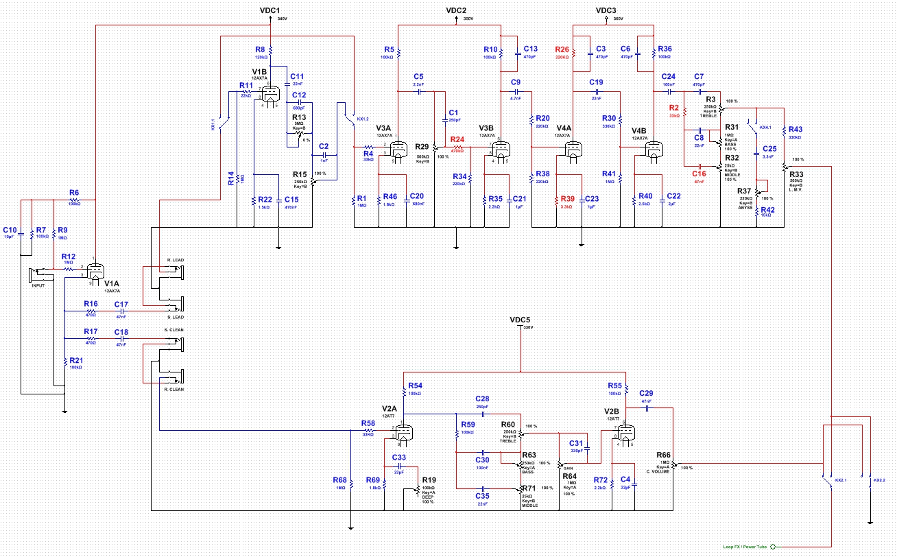 Anche sui Marshall è stato fatto allo stesso modo, ad esempio sul JCM800, nel canale dove le due valvole possono essere messe in serie a seconda di dove infili il jack, la V1a ha il catodo bypassato mentre la V1b ha una resistenza di catodo molto alta che abbassa notevolmente il guadagno oltre a starare la polarizzazione e fare distorsione.