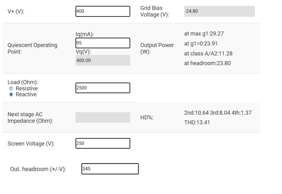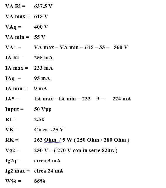 RL = 3000; VA = 400 V; IA = 95 mA; VG2 = 250 V; WATT = CIRCA 15,3; THD = CIRCA 13%