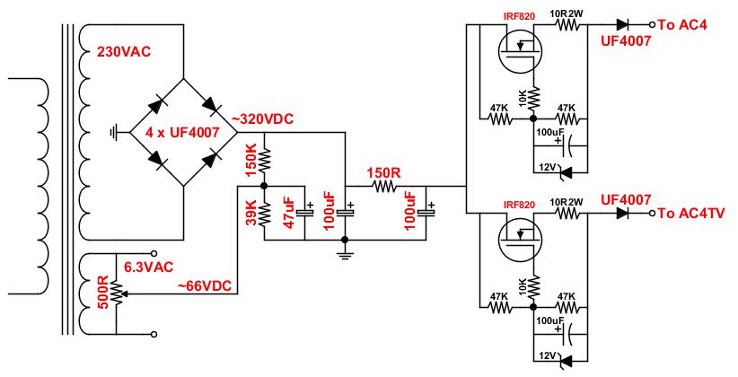 In pratica quello disegnato da me è una parte del PS (in comune tra i due circuiti) che va a sostituire da una parte (AC4) la parte di rettifica a Valvola mentre dall'altra (AC4TV) una rettifica FW a due diodi + CT