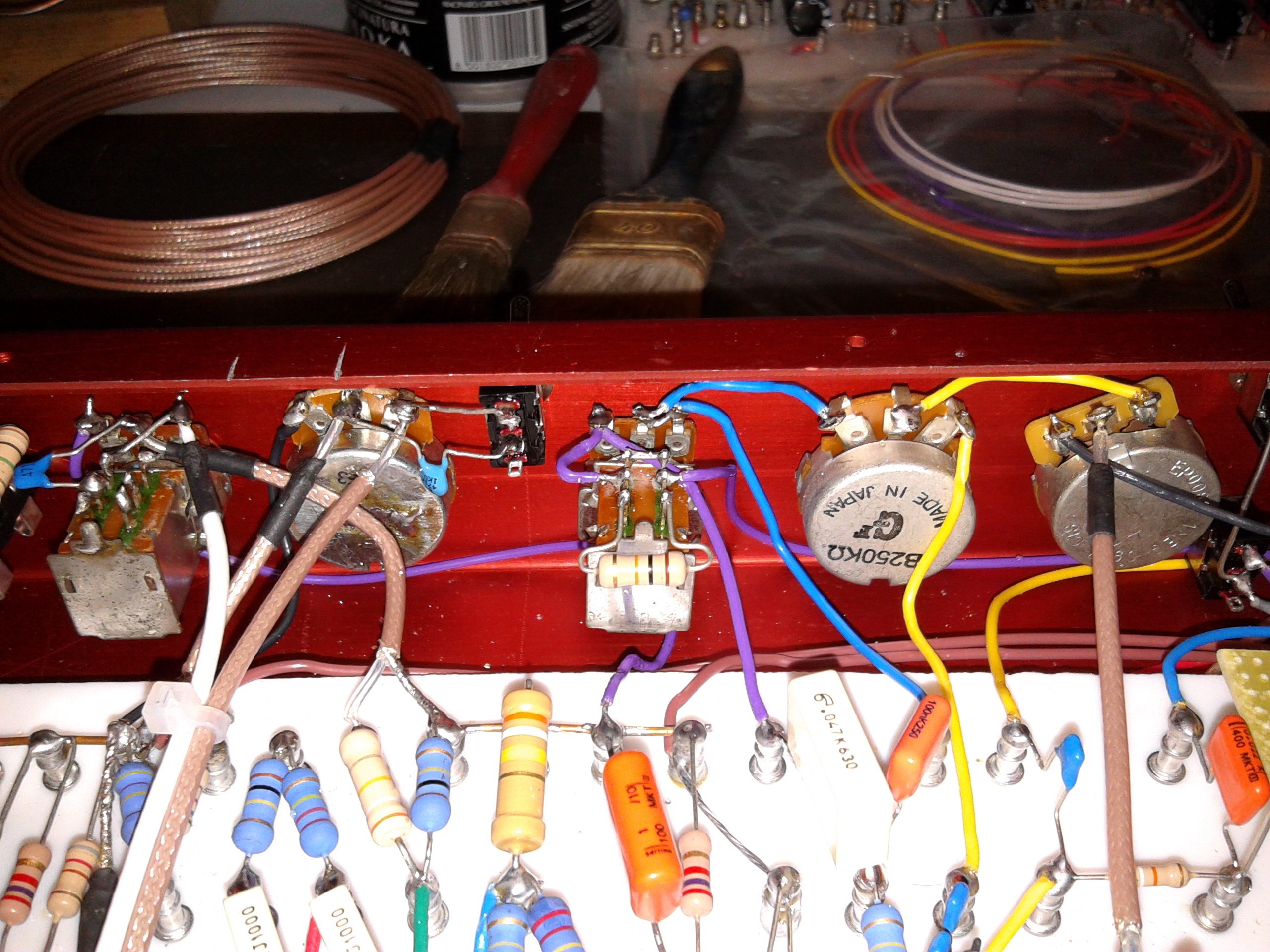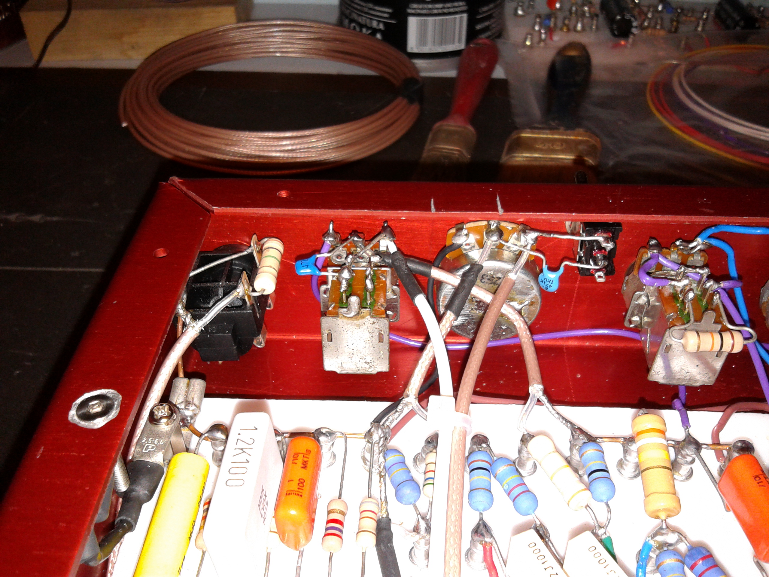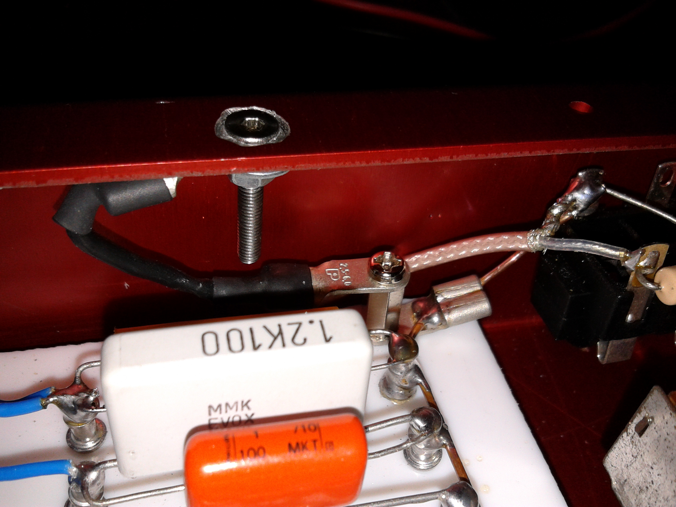 Allego delle foto della 2° versione ( componenti con valori diversi che provavo nella fase di sperimentazione ) per mostrare il gli ingressi e le uscite con cavi schermati ( RG 174 specifiche militari ). Tutti gli altri cavi non schermati sono anch'essi in rame argentato con isolamento in teflon spessore sia 1,5 mm, isolamento 1000 v / 14 A.