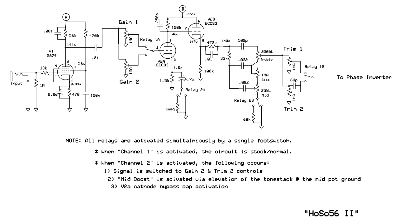 Con S1 aperto V1a e V1b lavorano in parallelo (il jack input Low è collegato allo switch del jack input High) e V1b, avendo un catodo privo del condensatore di bypass, ha un guadagno molto basso