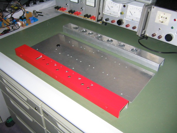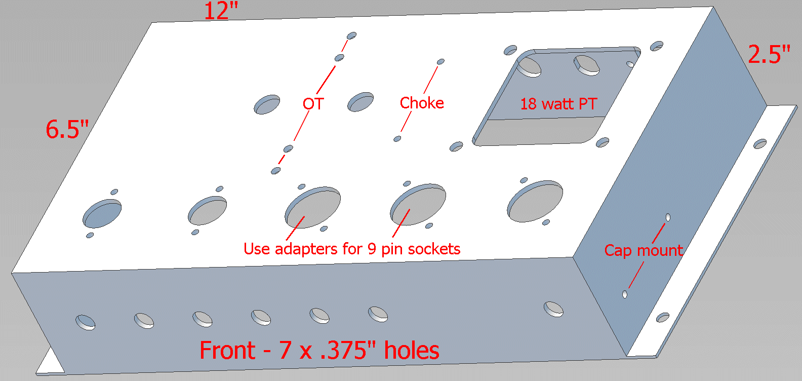 Naturalmente è solo un esempio di come aggiungere il front ed il rear, la disposizione delle valvole, nel tuo caso, la farei sul Top (la piastra in ferro), vedi le misure di questo chassis che sono quasi identiche a quelle della piastra in ferro che hai (1" = 2.54cm circa), nelle immagini, però, i fori per le valvole sono più grandi di quelli che servono a te in quanto il 7 Cylinder usa tutte valvole a 7 pin e non ad 8 e 9 pin, di conseguenza i fori basta farli più piccoli (non ricordo a memoria di che misura vanno fatti i fori, ma se serve posso recuperarla facilmente), se il tuo TA è per montaggio verticale sei anche esentato da dover fare il grosso foro quadrato per montarlo sul telaio