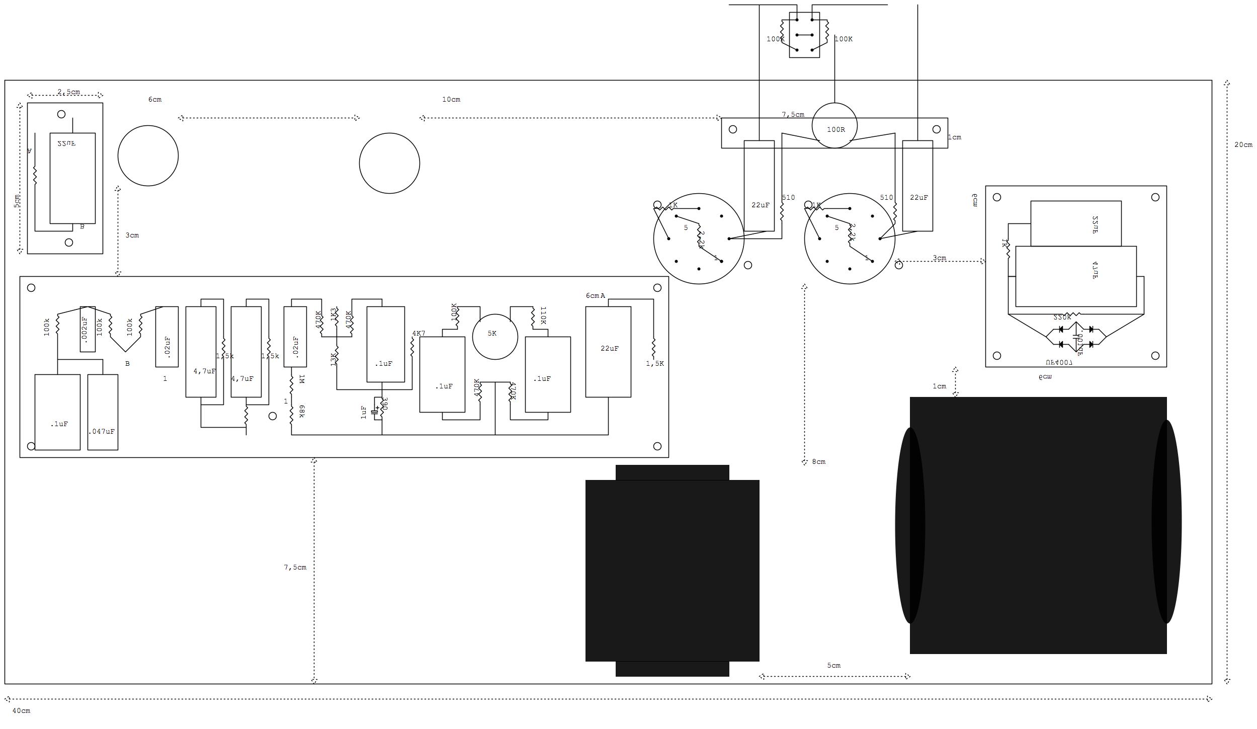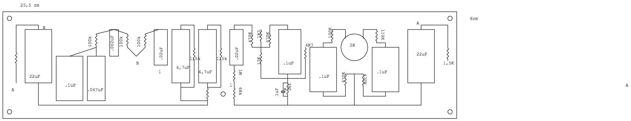Sarà circa 6cmX30 cm volendo fare l'alimentazione sulla stessa board dell'amp, il tonestack sui pot e il finale cablato sui socket e la modifica di gezaar direttamente sullo switch(unico problema sarebbero i condensatori per bypassare i catodi delle finali che messi volanti sono un po' grandini...)