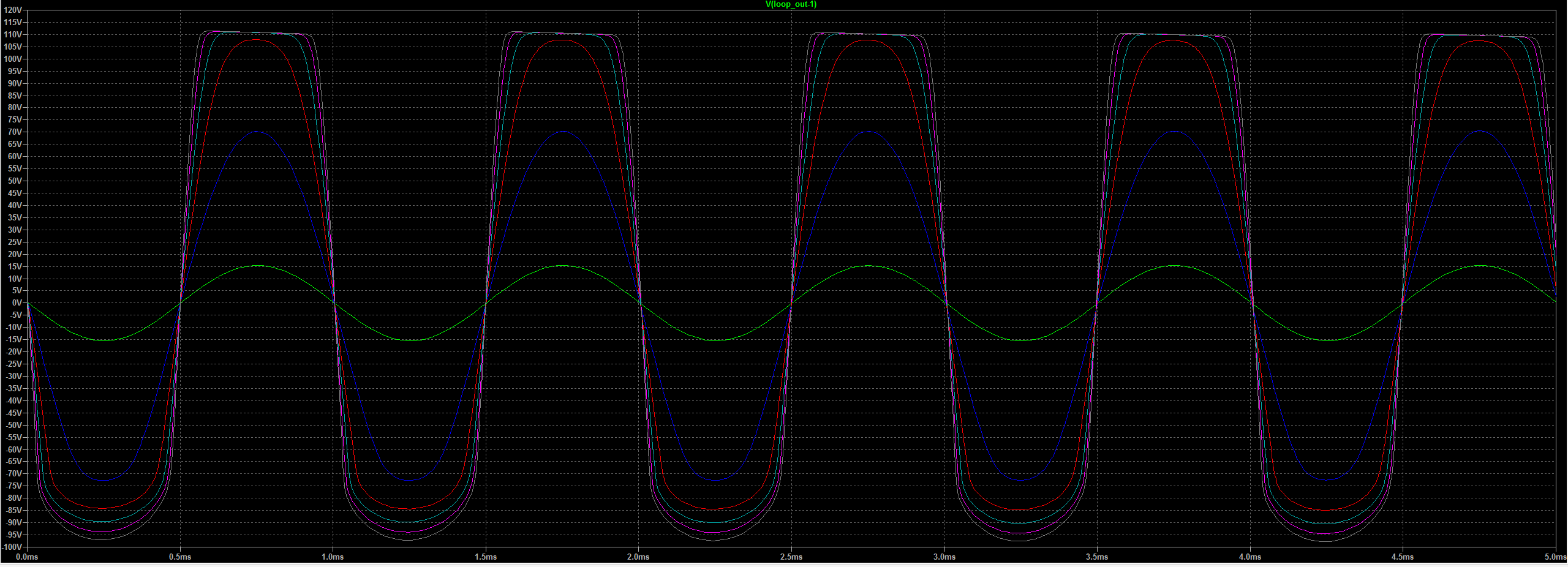 Come si può osservare dai grafici, tramite la controreazione dovrebbe essere possibile avere un segnale in ingresso che comincia ad essere schiacciato a circa 15 Vp / 30 Vpp. Questo sacrificando un pò di gain.