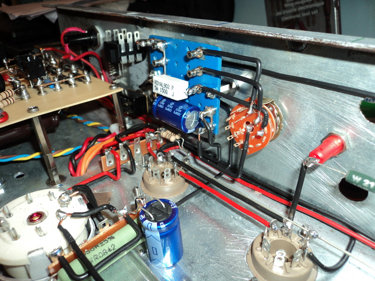 Ho fatto un mix tra basetta mille fori e turret per implementare la commutazione da 8 ohm a 4 ohm quando si cambia valvola ( 6L6GC oppure EL34 ). Quelle di Tube Town sono eccezionali, ma i reofori stagnati sono troppo vicini e quì vorrei che la sezione dei cavi sia almeno da 18 awg. Per questo ho messo le turretts, ma il problema era la zoccolatura dei relè troppo vicina per adattarci le turrett anche lì.