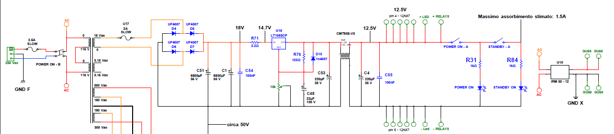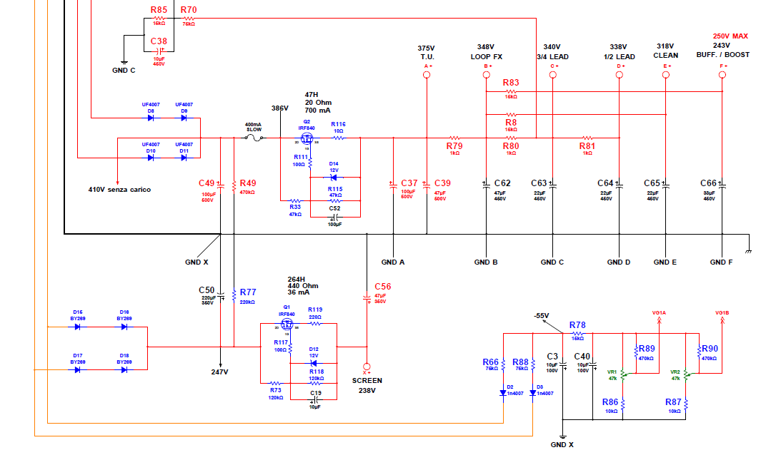 Ho deciso di fare un passo indietro e ricominciare bene da quello che avevo preventivato di adottare: un secondario dedicato alla tensione delle griglie schermo delle finali. Avevo cmq risolto il probelma dell'hum tramite l'impiego di più celle di filtro R - C dall'alimentazione anodica. Ma il comportamento della griglia non era proprio il top simulandola. E vero che i cap di filtro fanno si che non ci sia una SAG come quando si mette solo una resistenza in serie ad esse ( quindi compressione e calo ), ma ho pensato che fosse meglio scegliere una terza strada.