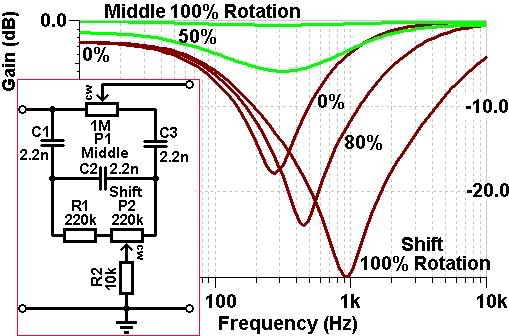 Le due resistenze indicate da 33k fino a 100k vanno scelte sperimentalmente e servono per avere la risposta in frequenza più neutra possibile, altrimenti ruotando i pot un po' il tono potrebbe cambiare