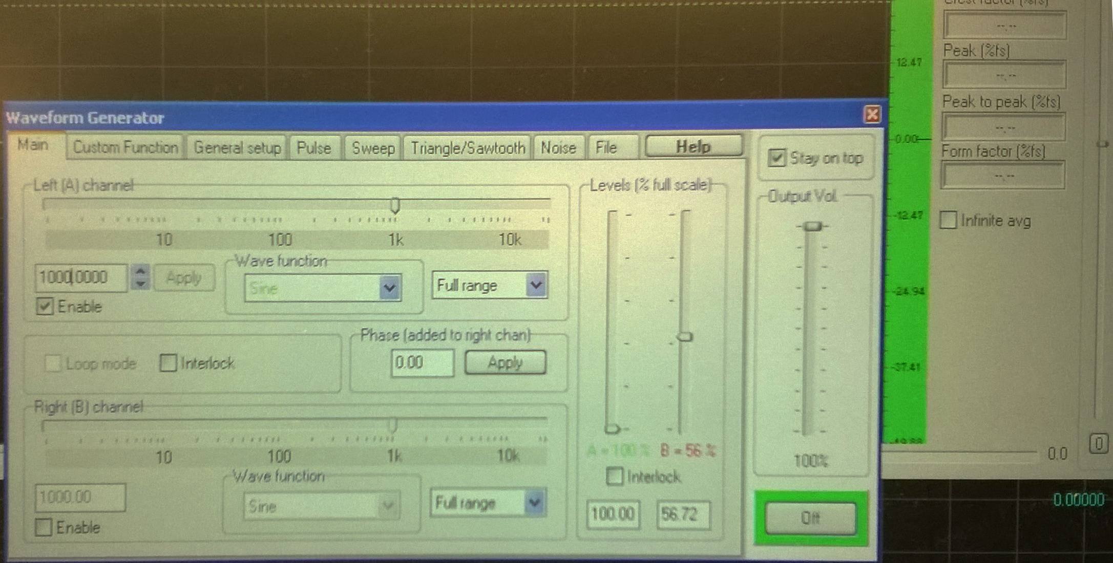 esco dalle casse del pc , con visual analyzer creo una sinusoide e poi la misuro con l'oscilloscopio