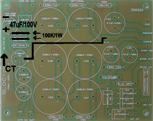 quello in foto è il circuito per elevare il center tap dei filamenti,quindi 47 uF e res da 1M e 100k,questo perchè poi su quel punto ti arriveranno quei 40/50V.