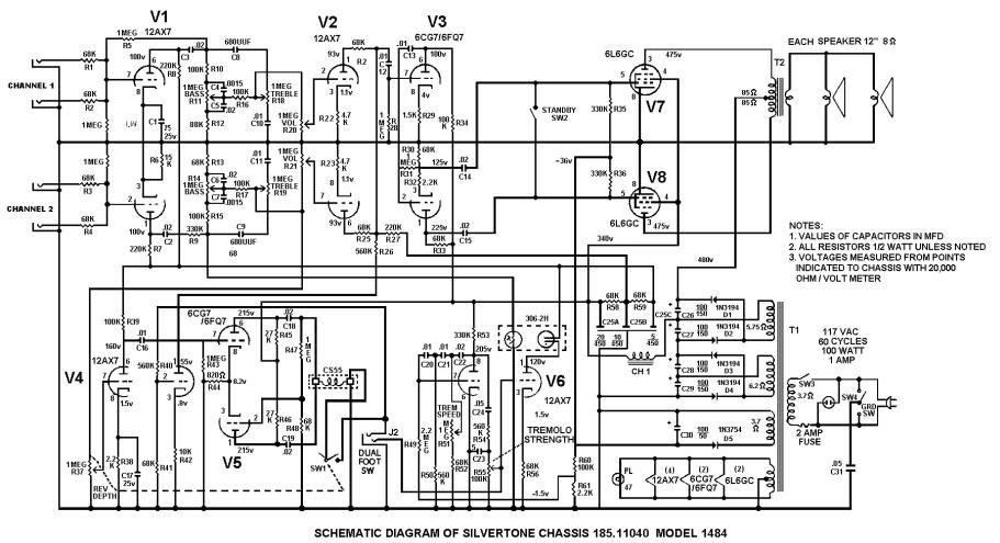 Solo oggi ho visto lo schema del Silvertone 1484 e sono contento di verificare che la mia idea di usare un duplicatore e metterlo anche in serie con altri raddrizzatori non era così campata in aria, nel Silvertone 1484 ci sono adirittura due duplicatori in serie