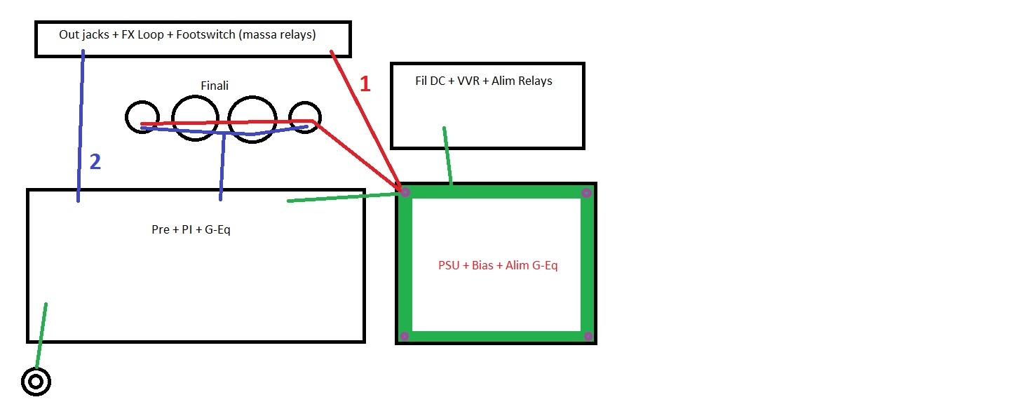 - Traccia rossa: Soluzione 1 - finali e board LoopFX+FootSW+Jack Output connesse a star ground
