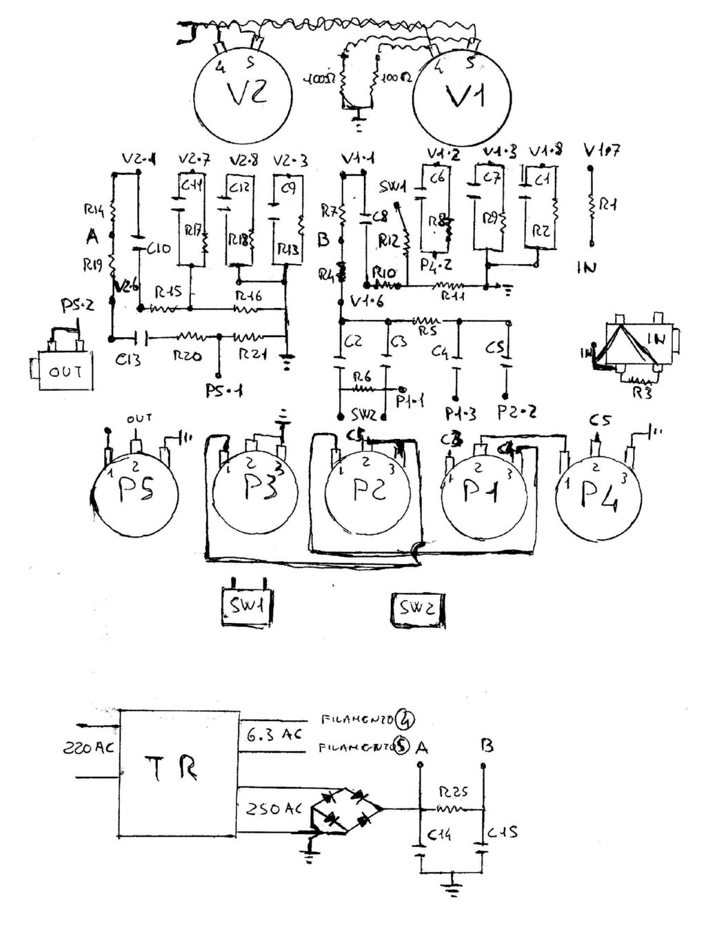 mg66, non intendevo c6 e c11, quelli lasciali da 470pF... Quelli che dicevo io sono due cap che avev(o/amo) omesso nello schema, vanno a cavallo fra anodo e catodo dei triodi della seconda valvola...