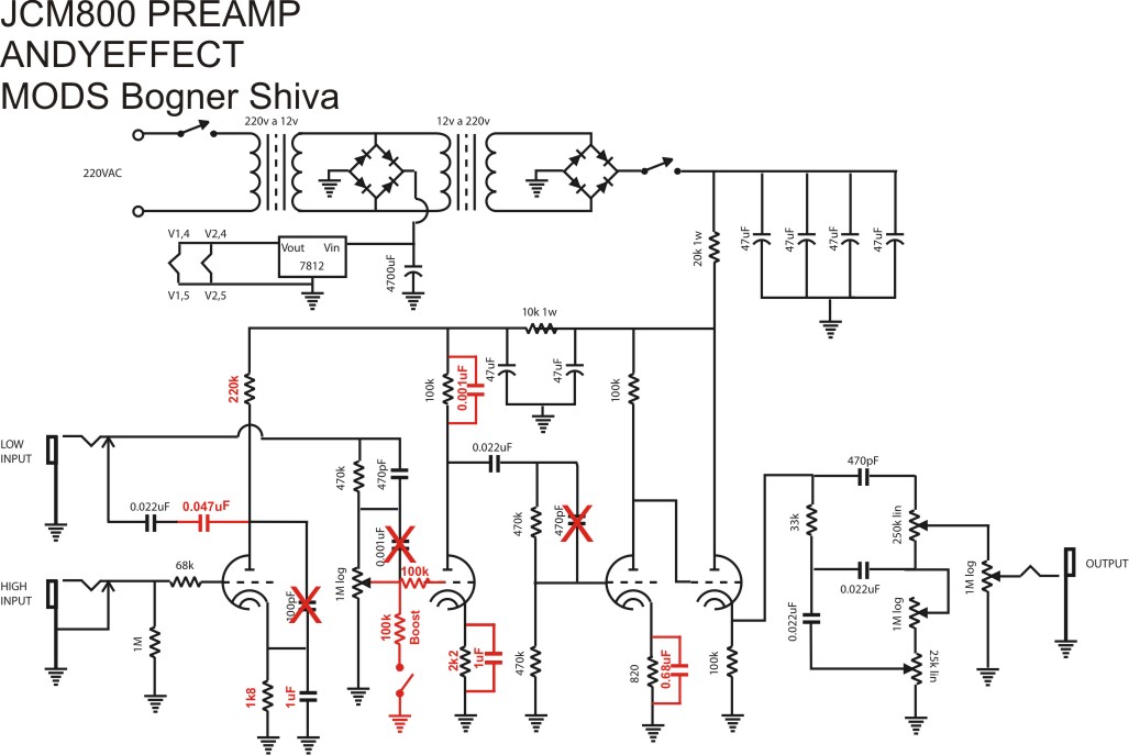 1 ) il canale pulito sarebbe quello dello schema allegato il fender twin ha una resistenza di input da 33k mentre il marshall ne ha una da 68k