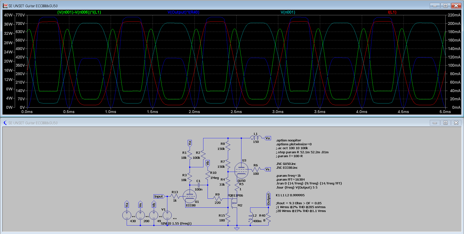Qui siamo con 3k di Ra, carico nominale, escamotage per avere qualche watt in più (1 Wrms a 2% THD e 20W a 15% THD) pur partendo da una buona seconda armonica iniziale ed un damping relativamente basso, sempre con il bias all'80% (cosa non vi torna, di primo acchito?):