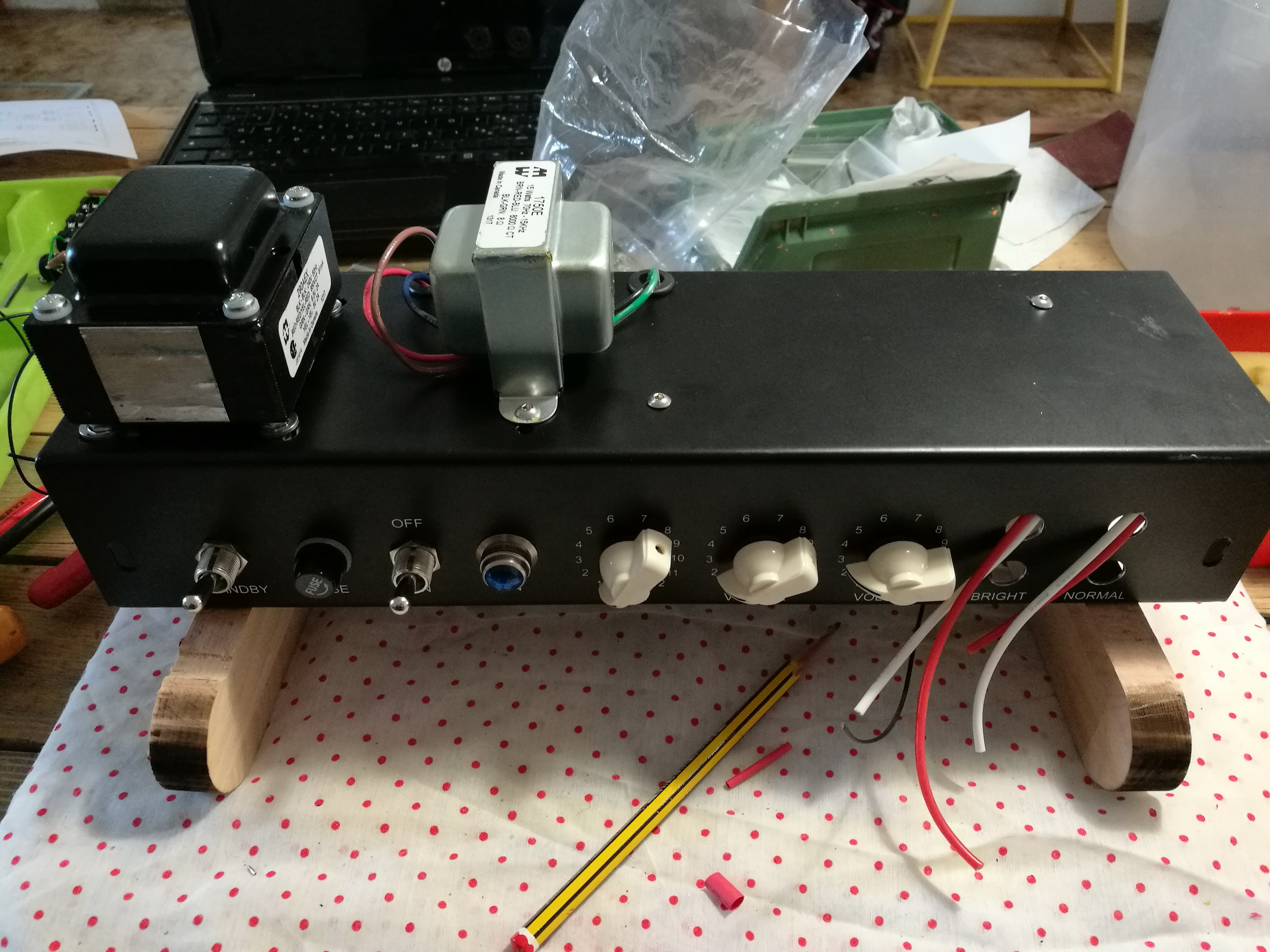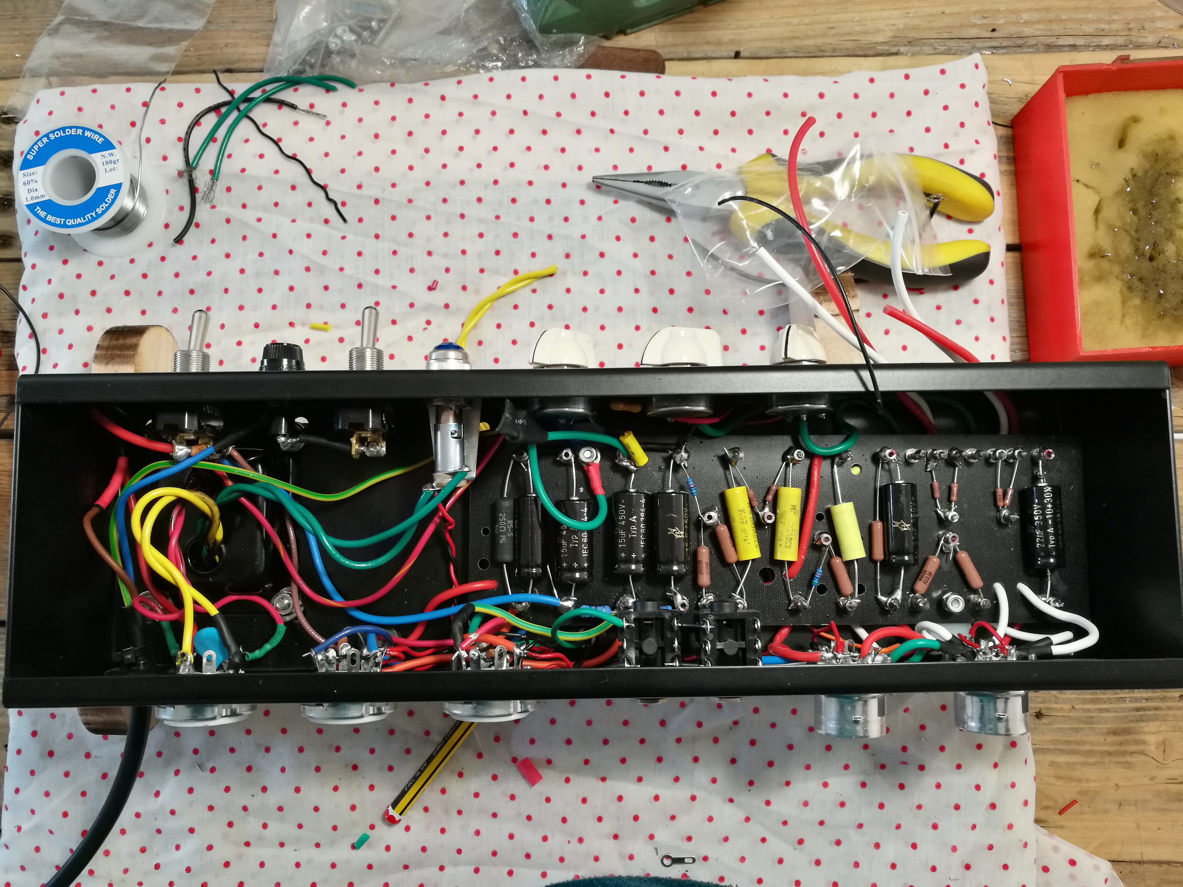 Quasi pronto, mancano solo due condensatori e i jack di ingresso.. ho testato le varie saldature ed è tutto ok, fatta la prova del 9 inserendo la presa e funziona, non sono ancora esploso.. la lampada funziona, non trovo anomalie ed è schermato bene.. domani credo di finirlo.. buone Feste a tutti comunque