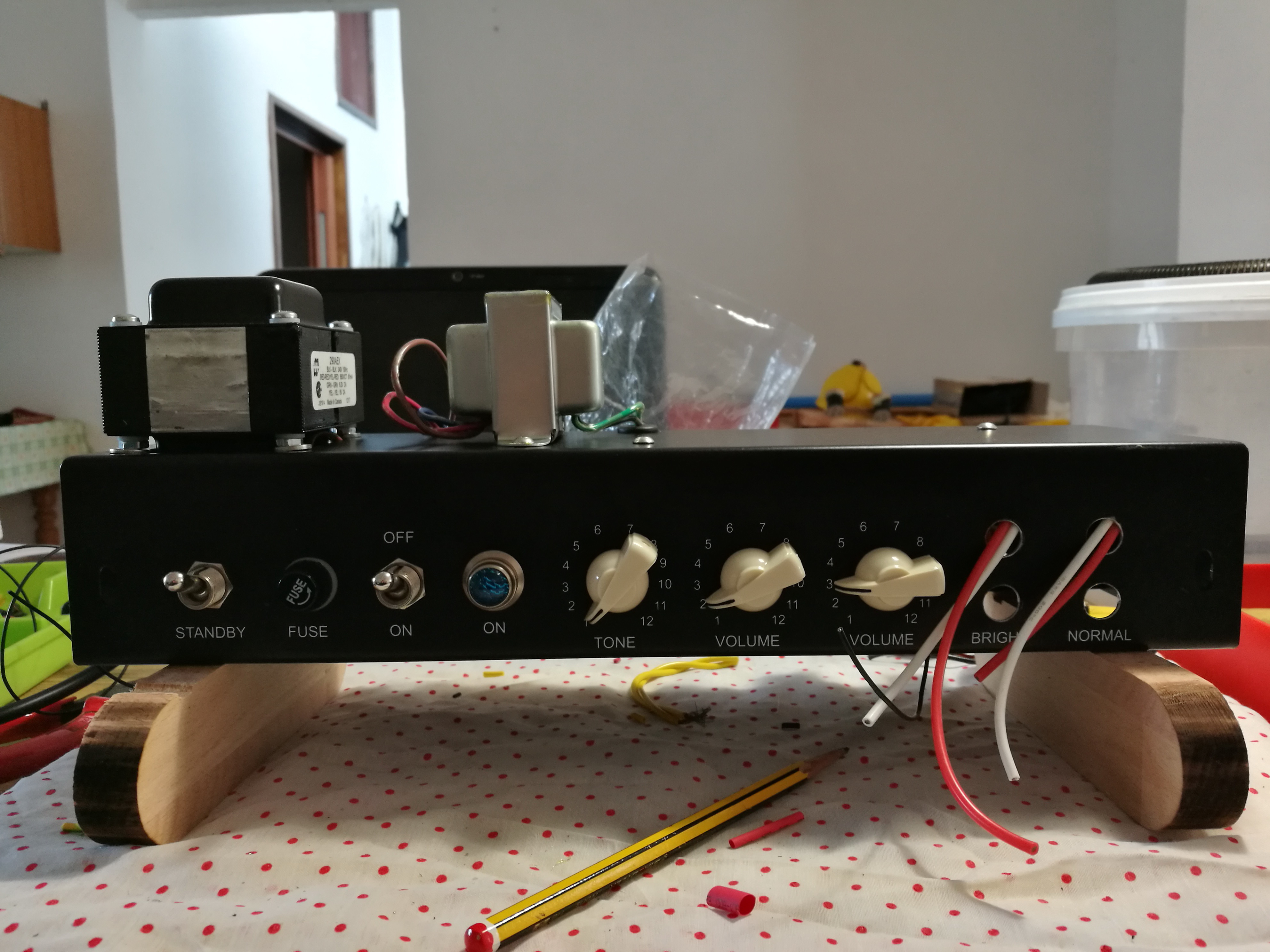 Allora saturare ad 1 di volume assolutamente no, controlla bene tutte le masse, probabilmente c’è qualche collegamento errato e/o saldatura “fredda”. Deve suonare bene anche a volumi sostenuti, satura giocando con le manopole, comunque sempre dopo metà dei volumi.