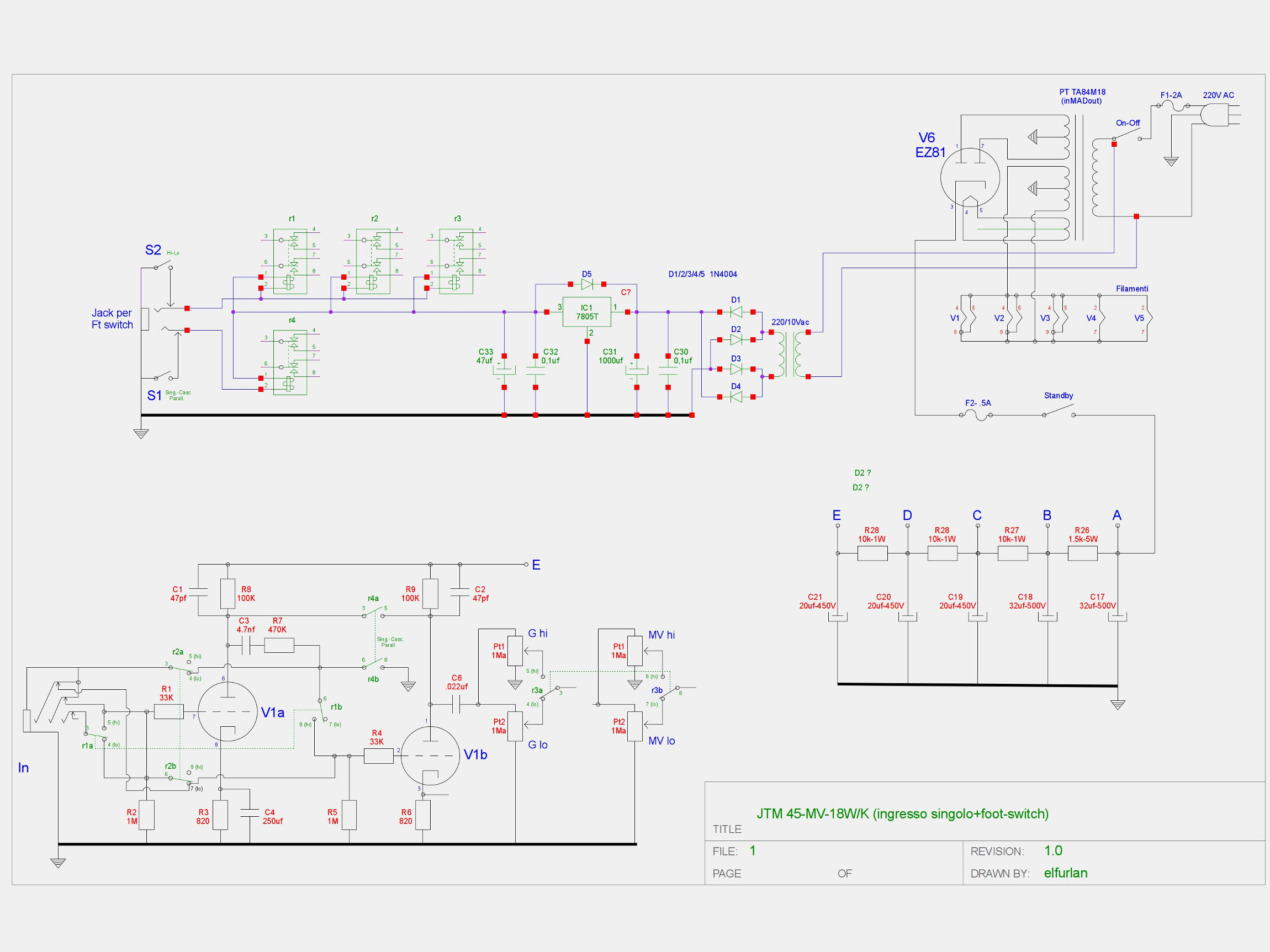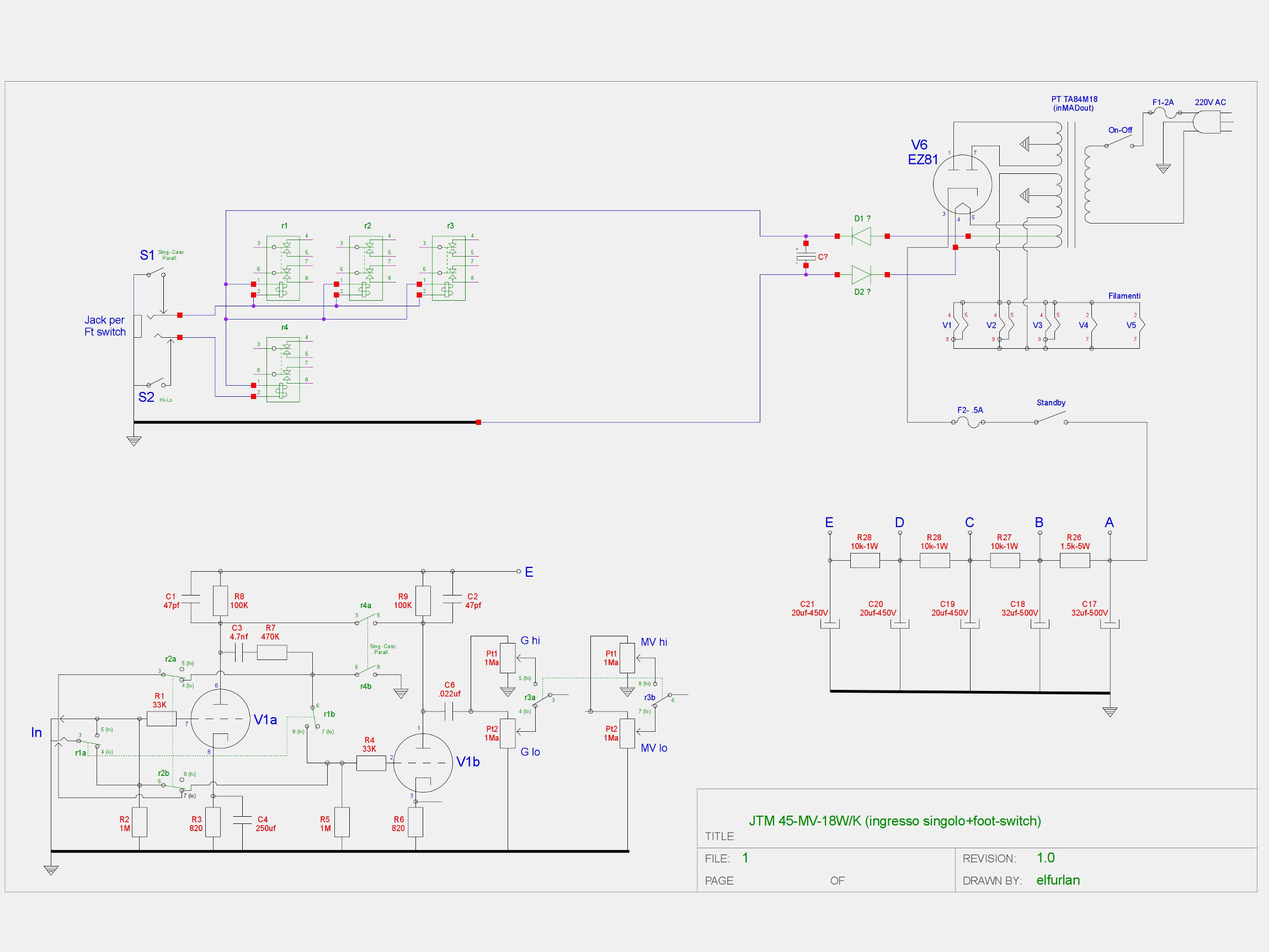 Ciao a tutti, eccomi qua. In questi giorni mi sono scervellato con le logiche degli scambi dei relè e relativa alimentazione per rendere l'ampli con un ingresso solo e comandabile da foot-switch.In ingresso ho pensato ad un jack stereo che mette a massa le griglie di V1a/b quando non c'è il jack della chitarra inserito mentre le posizioni degli scambi sono a relè diseccitati; l'unico neo di questo circuito trovo che sia S1 perchè "parallelo e cascata" corrispondono alla posizione della levetta dello switch opposte.Vi posto il risultato.