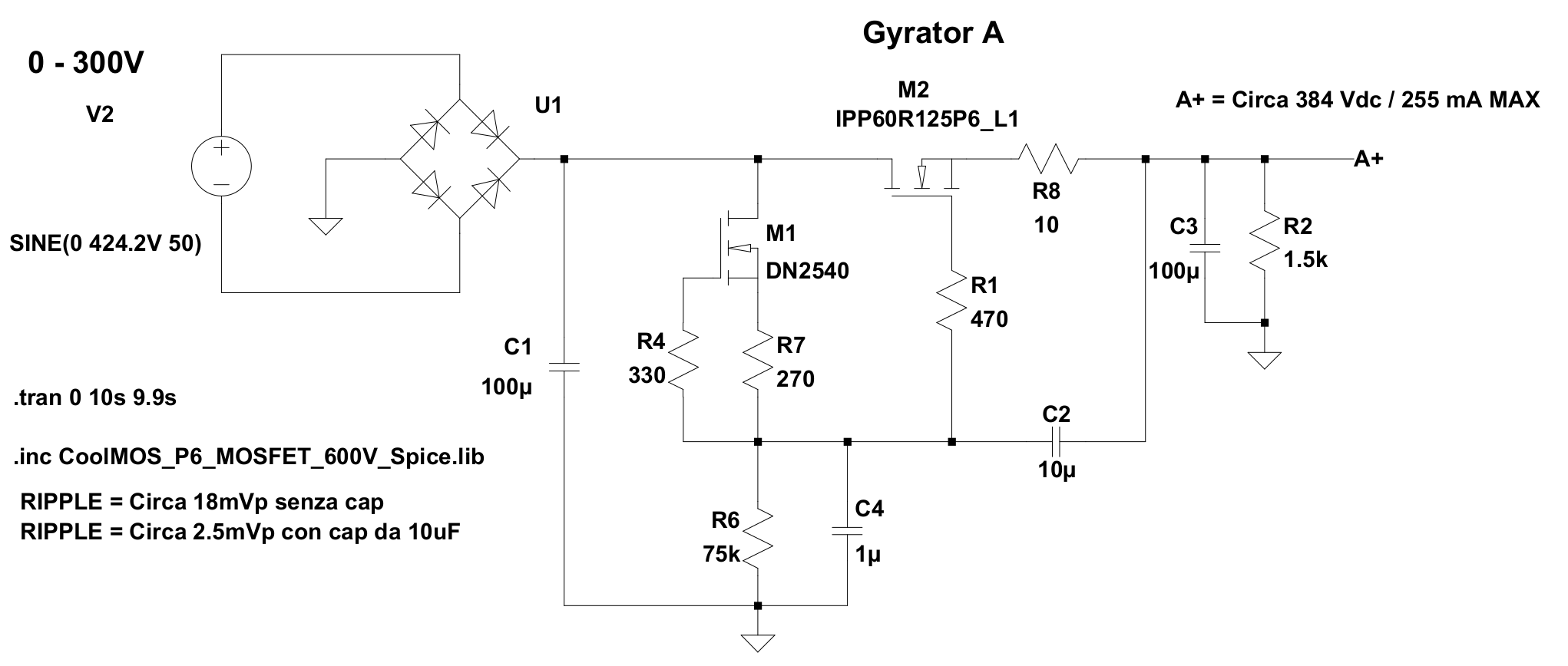 Da questo circuito (l'ho buttato giù al volo, quindi prendiamolo come spunto iniziale, non come oro colato) ottengo, imponendo 40 Vpp in ingresso e con 200 mA in uscita, circa 396 Vdc in uscita con 1,4 mVrms di ripple.