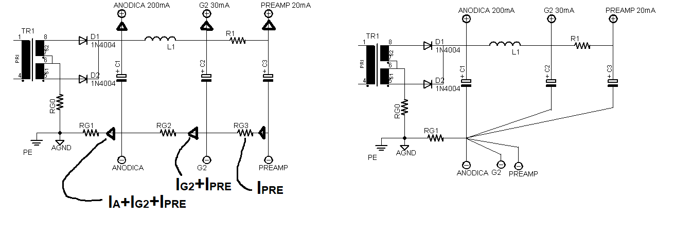 Questo schema con masse di segnale e di potenza separate è quello che poi uso per i miei preamplificatori perchè ogni scheda ha una serie di masse a stella che poi finiscono nella massa centrale della scheda di alimentazione.