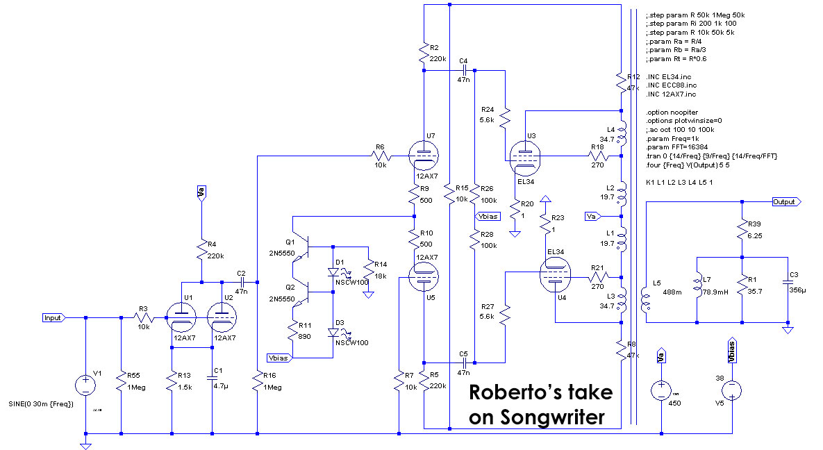 partendo dall'idea del Trainwreck Songwriter ho buttato giù questo schema per un finale con EL34 ed la configurazione del finale tale che suoni "da triodo". Non tenete conto del fatto che non c'è l'equalizzatore, quello lo aggiungerò dopo. Mi premeva verificare che con 30 mVp in ingresso sia possibile raggiungere piena potenza con un solo stadio. L'equalizzatore sarà in stile Songwriter, quindi un controllo bassi ed un bright sul volume: efficace senza togliere troppo segnale.