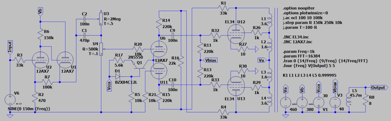 Questo amplificatore per chitarra (non dico anche per basso perchè ha circa 45 Wrms al 5% di THD, che per basso sono un po' pochini, ma si può scalare a salire passando ad un quartetto di 6550 o altri bottiglioni simili) che sto buttando giù su carta partendo da un'evoluzione di un altro ampli per Hi-Fi che ho realizzato.