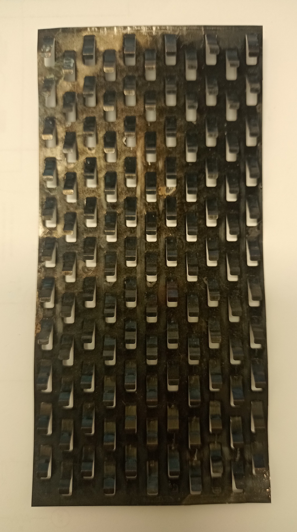 un foglio (in realtà sono 2 sovrapposti) da 1/10 di mm di spessore, che misura 6.2cm x 13.8cm ed i cui baffetti si alzano rispetto la lamina di 4mm
