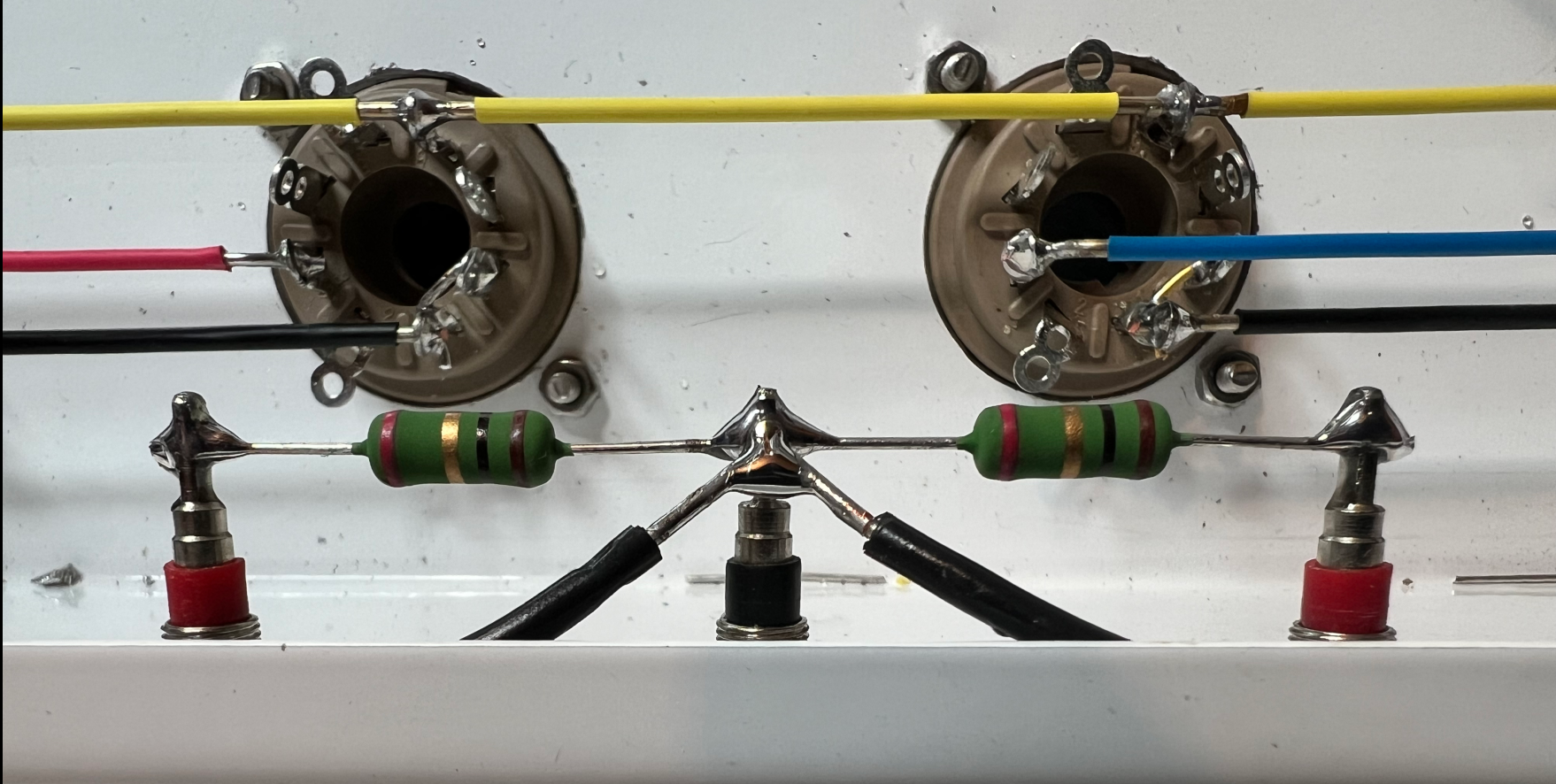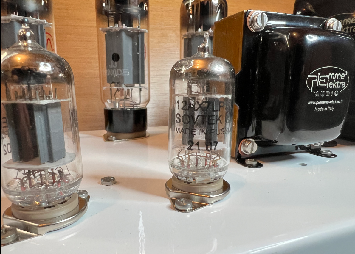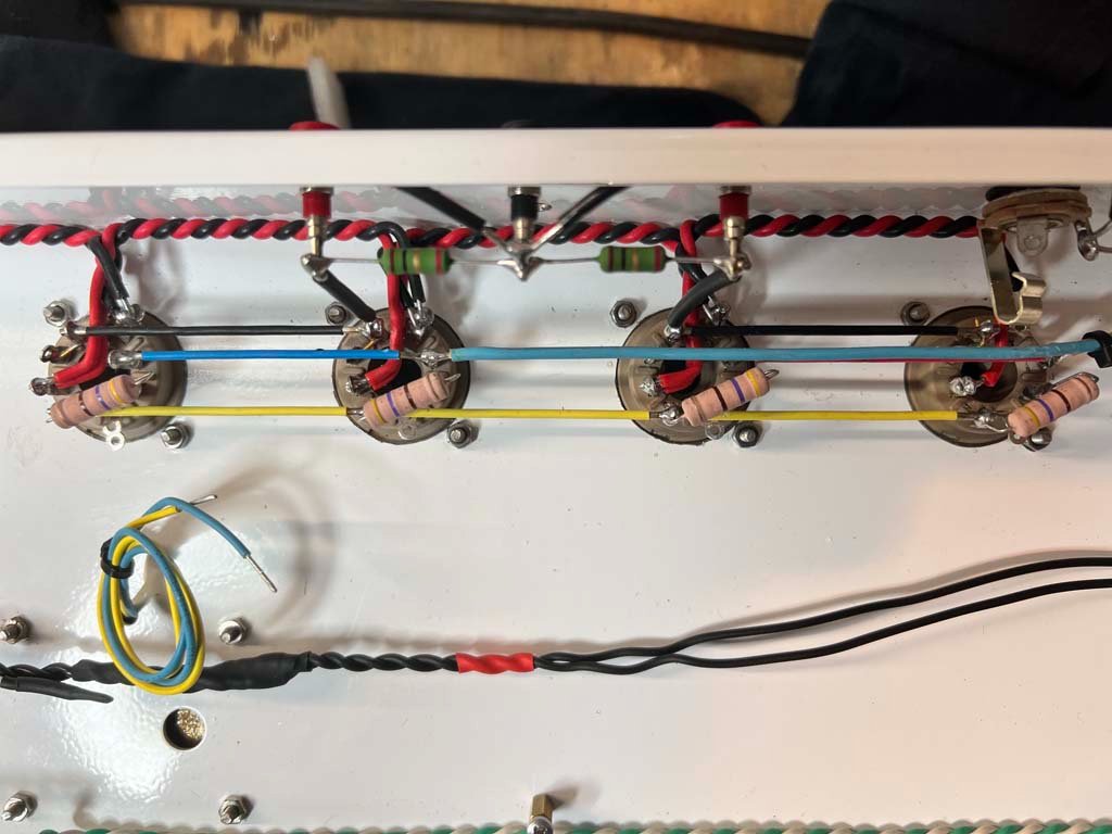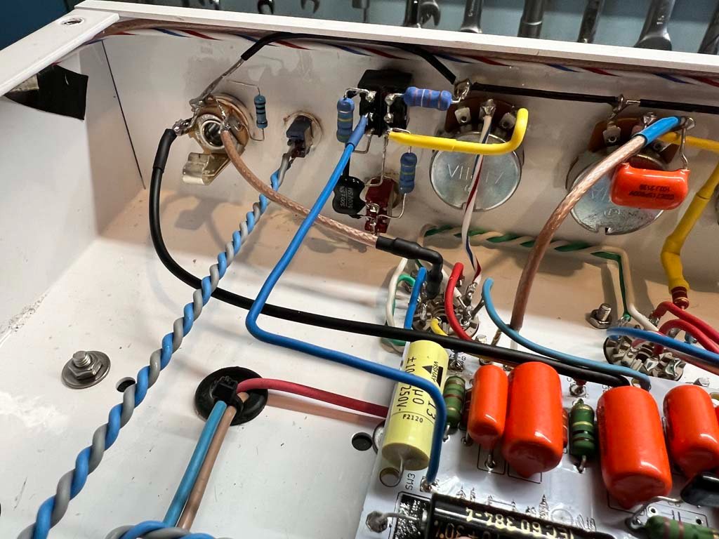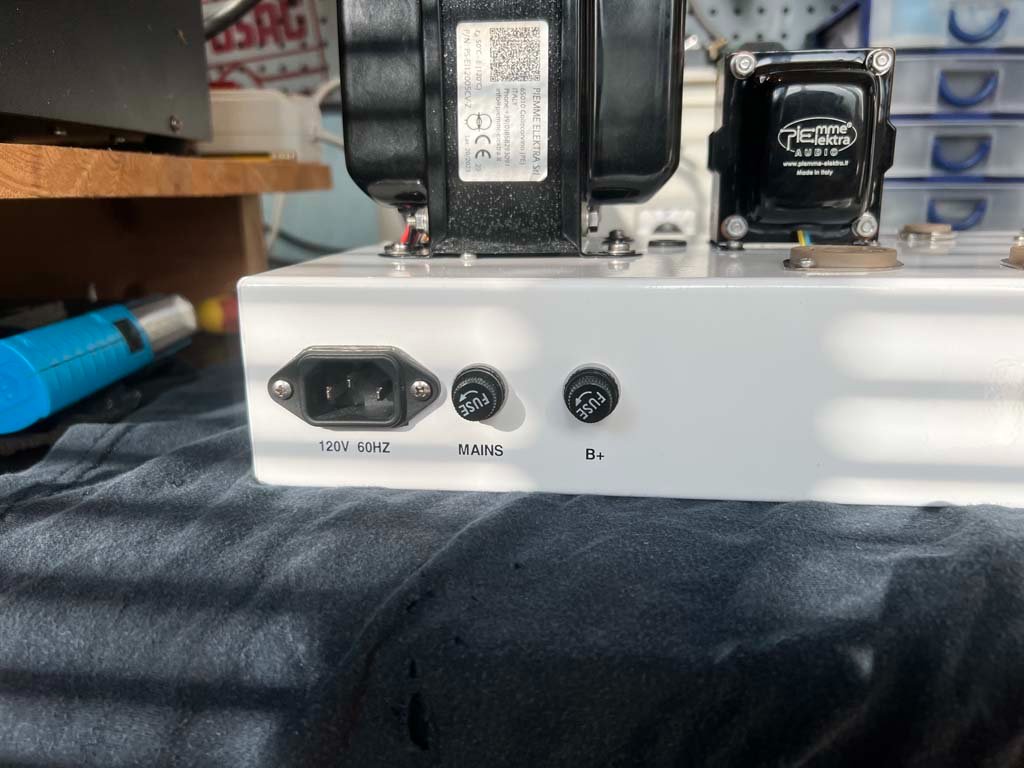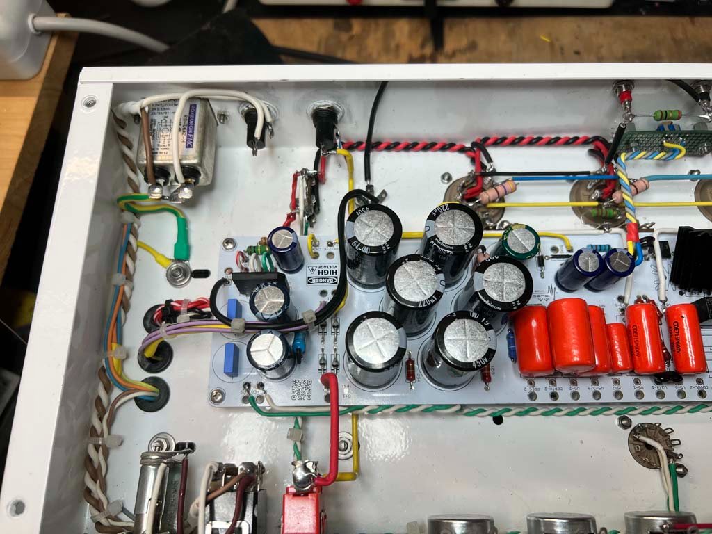E' tutto molto silenzioso. Complice il fatto che le prime 2 valvole di preamp sono alimentate in continua. Per la cronaca: dopo la retifica fatta da un semplice ponte diodi e una CRC di filtro, la tensione che arriva ai filamenti è di 5.9V. Secondo me sufficienti.