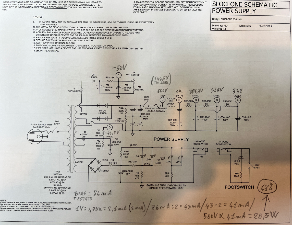 A matita c'è riportato il calcolo effettuato per sapere la dissipazione. La lettura fatta tramite le prese a banana jack piccoline sul retro dell'ampli, danno una corrente DOPPIA perchè è per ogni coppia di valvole. Stiamo sui 20,5W a valvola.