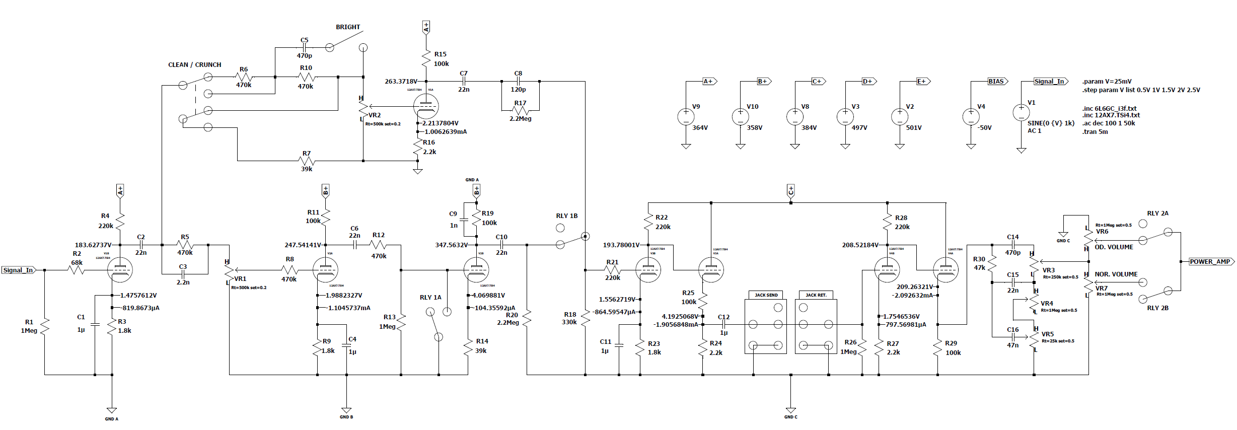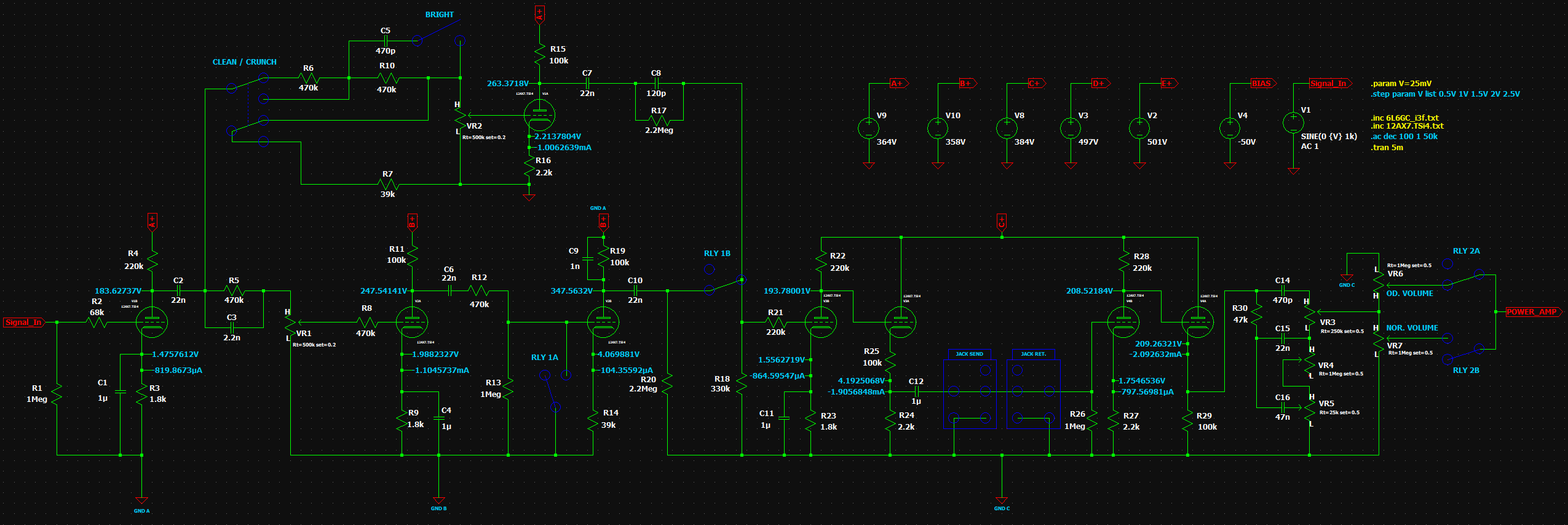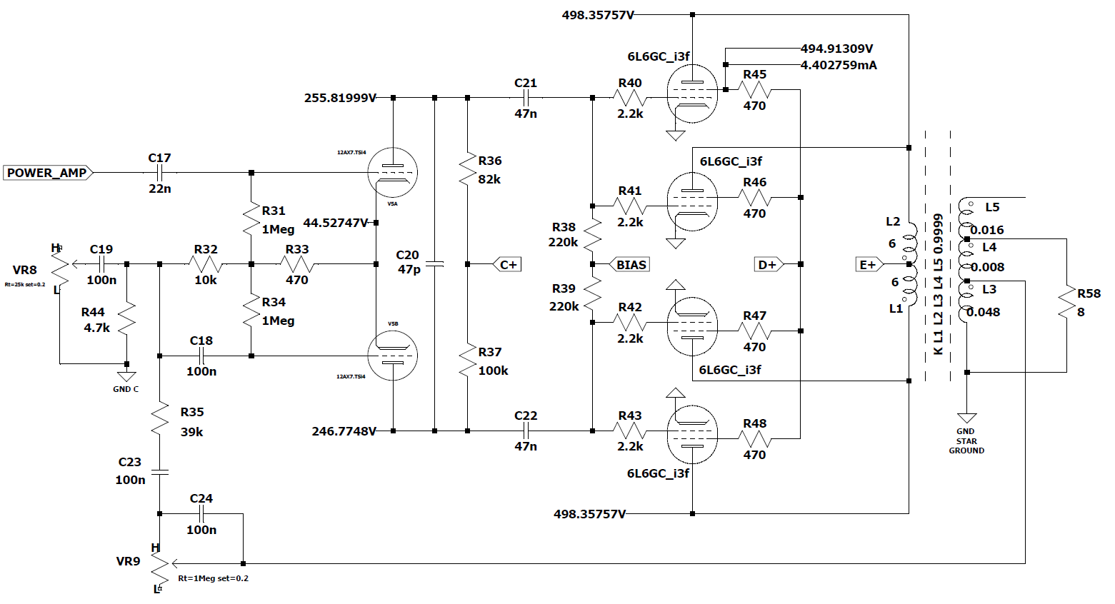 Sto attorno al 70% di bias per le 6L6GC. Ho calcolato anche la corrente di griglia G2 basandomi sulle misure elettriche testate.