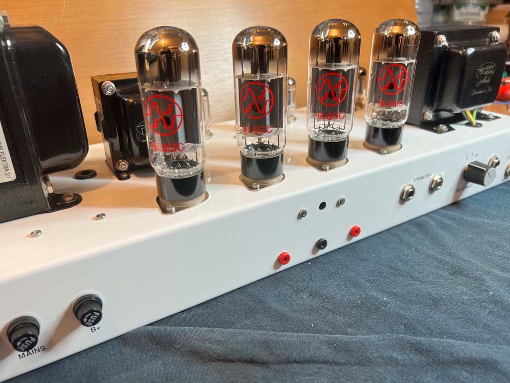 Dopo un paio di errori fatti per distrazione ( cavo del Send invertito sulla pcb, massa e segnale dei 2 jack degli speaker invertiti uno con l'altro ) e dopo aver messo nel giusto senso gli avvolgimenti del primario dell'O.T. ( feedback a canna! ), finalmente ho potuto sentire l'ampli.